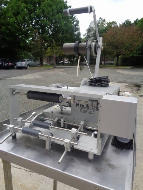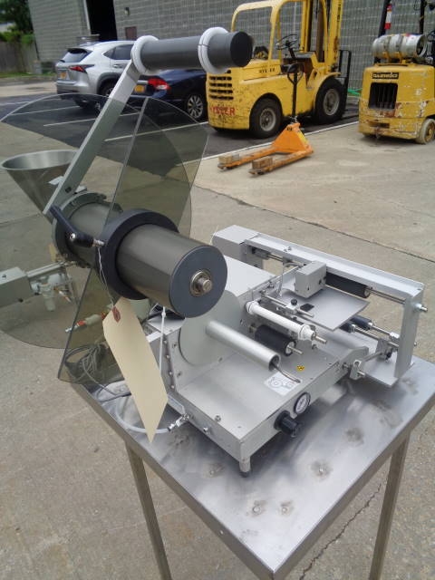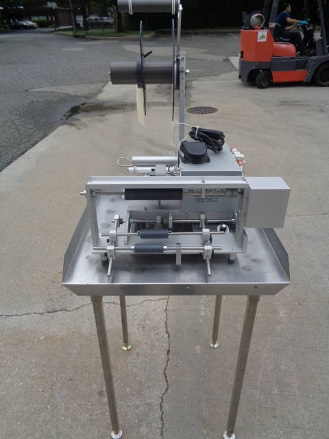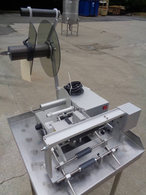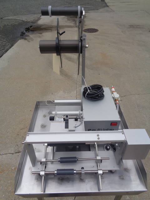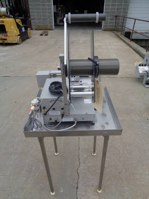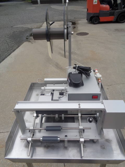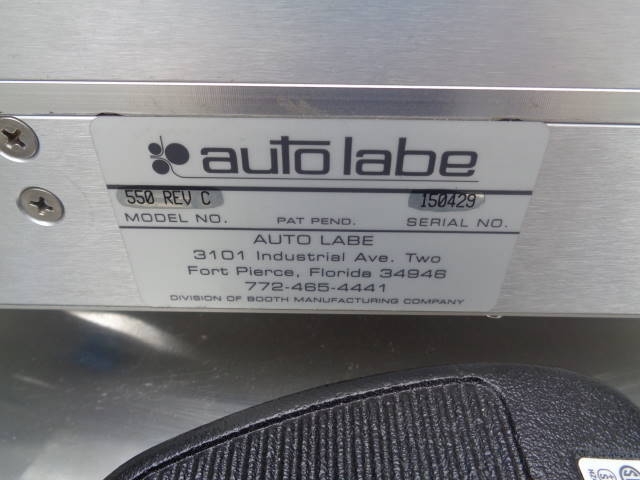 1-Used Autolabe Model 550-REV-C Semi-Automatic Pressure Sensitive Spot/Wraparound Labeler, S/N 150429. This foot switch activated Labeler uses single phase, 110 volt electrics and air. Stainless Steel Table shown in photograph not included. (Stock #8020C)