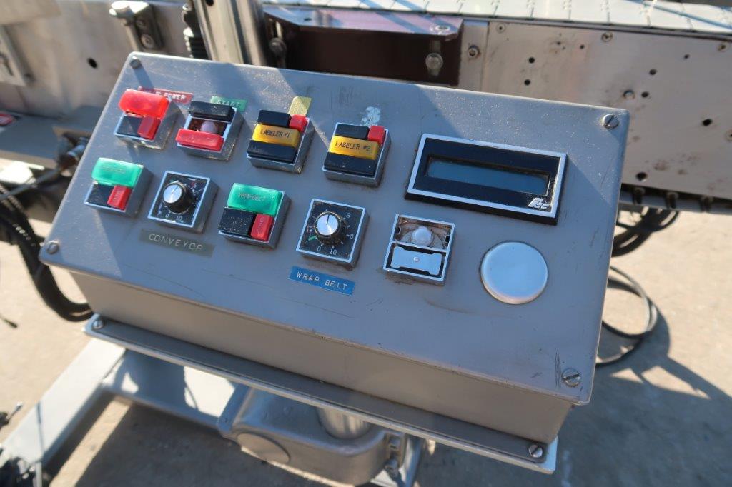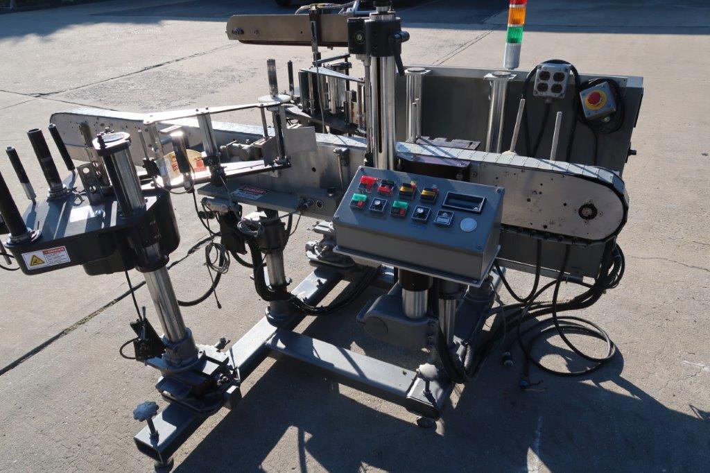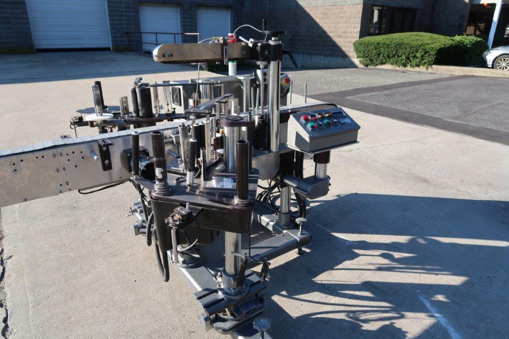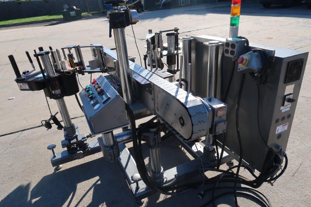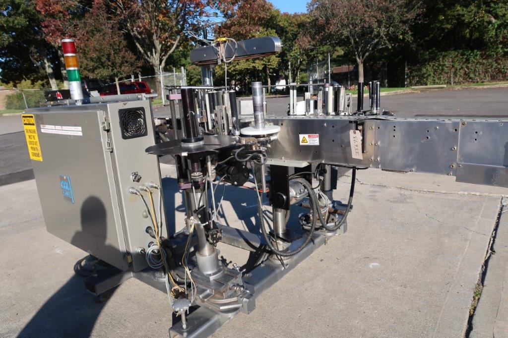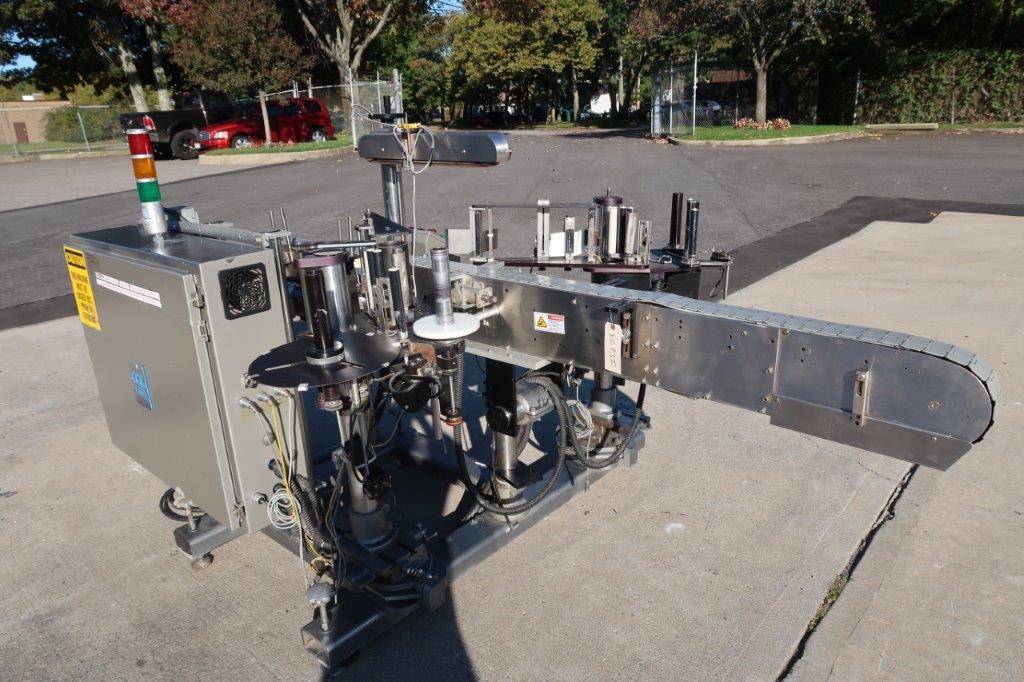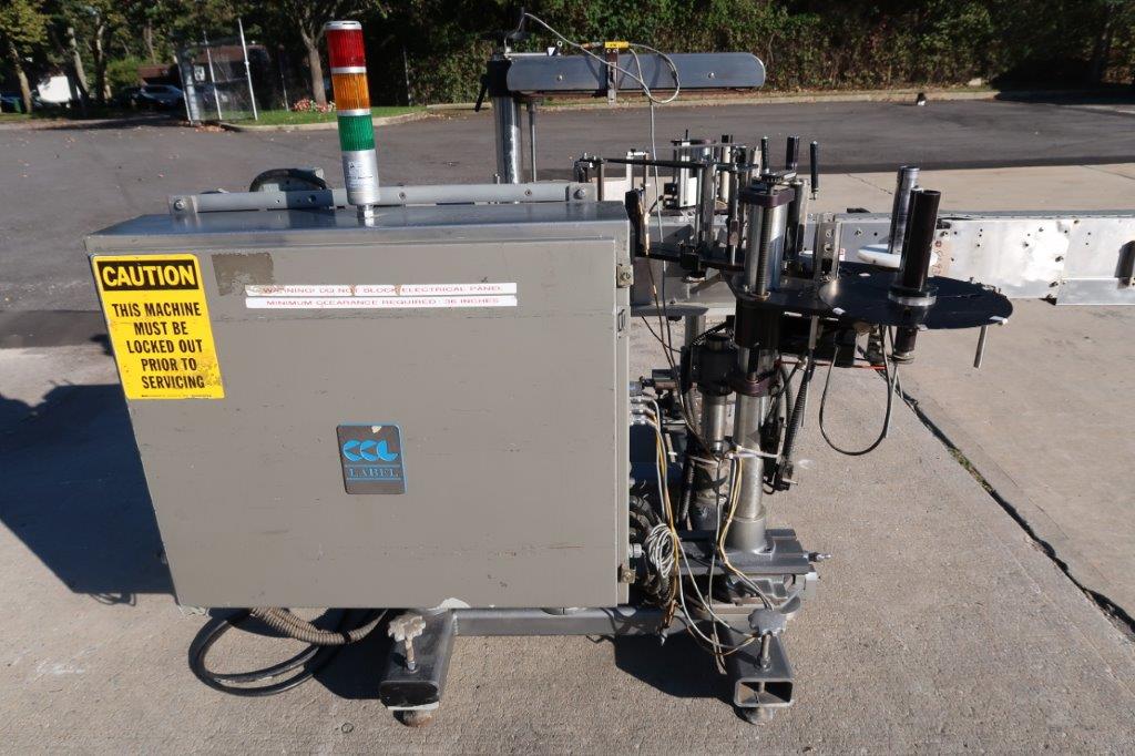 1-Used CCL Automatic Pressure Sensitive Labeling Machine. With front mounted control panel, labeler has speed controls and can be fitted for wraparound labeling and front and back labeling as well. With top “hold-down” stabilizing belt for taller containers, machine was last used in the personal care products industry. (Stock #8693i)