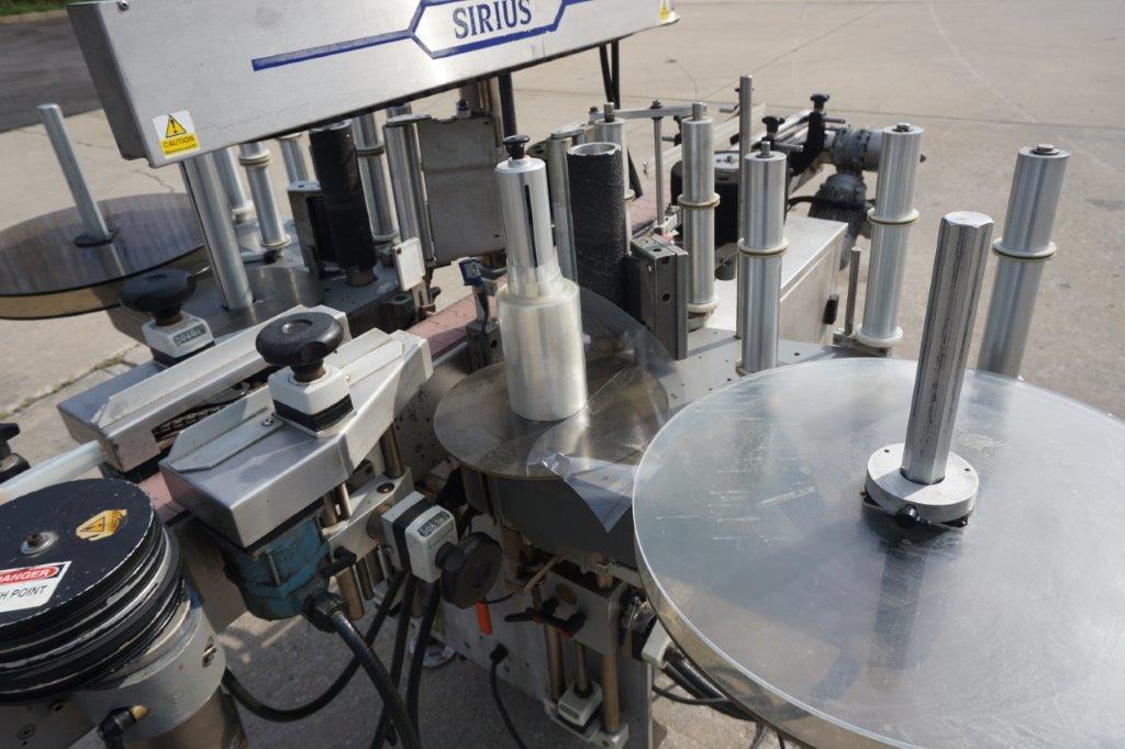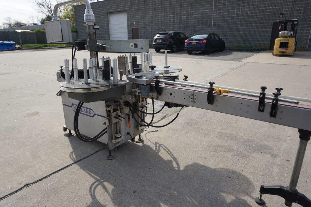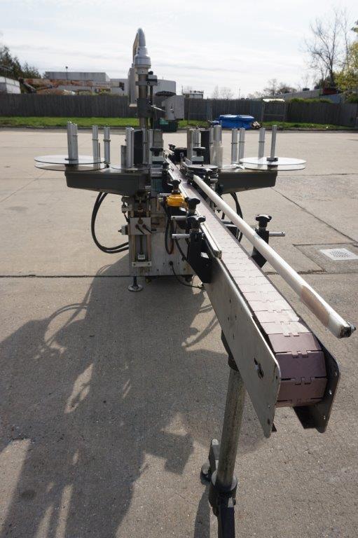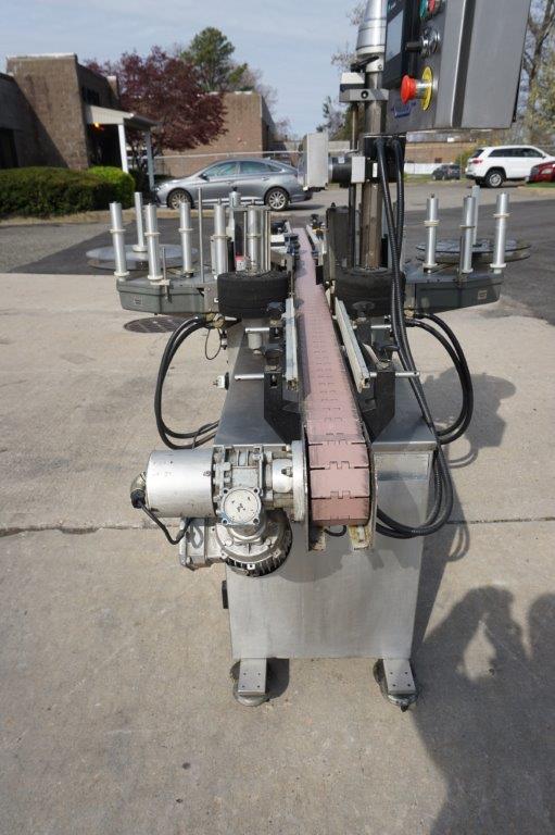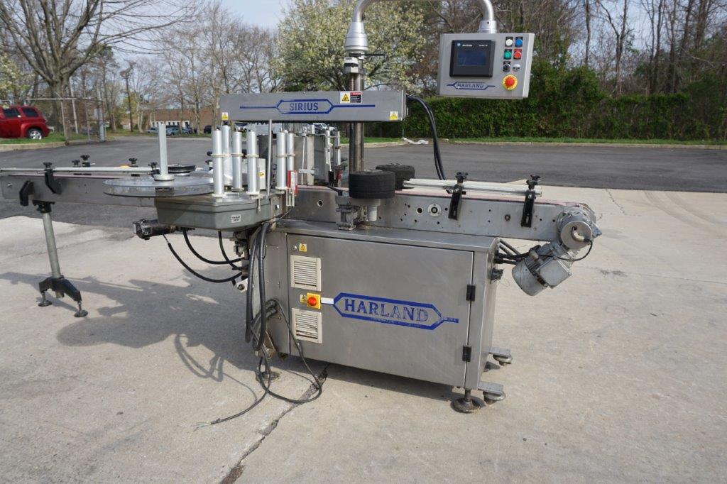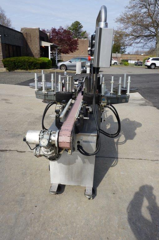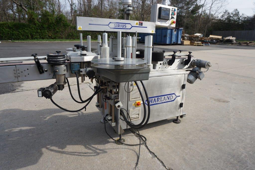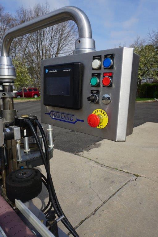 1-Used Harland Automatic Front and Back Pressure Sensitive Labeling Machine, Serial number J-31735/01. Last used in the personal care products industry, machine has control panel with Allen Bradley PanelView 550 PLC. With top hold down belt, machine is on casters for portability and has stainless steel cabinetry. (Stock #8640)