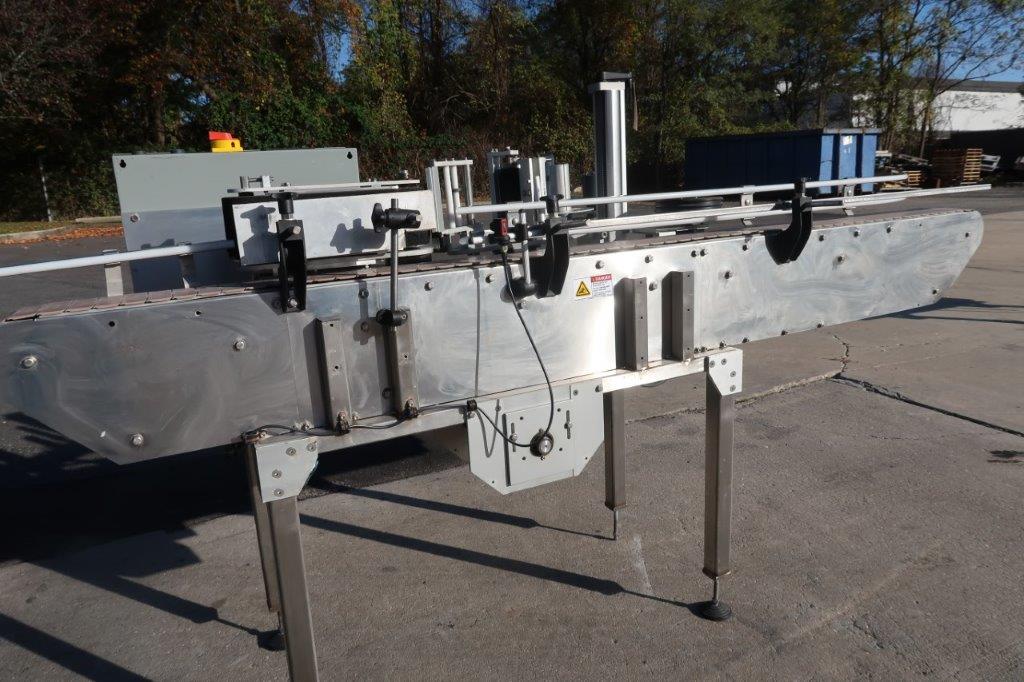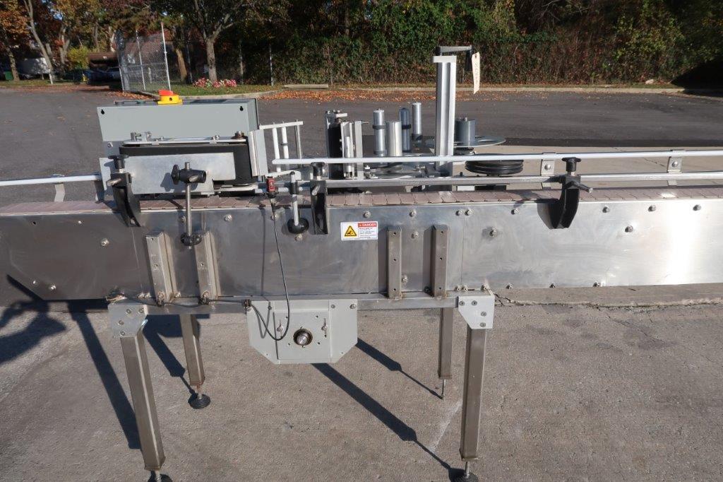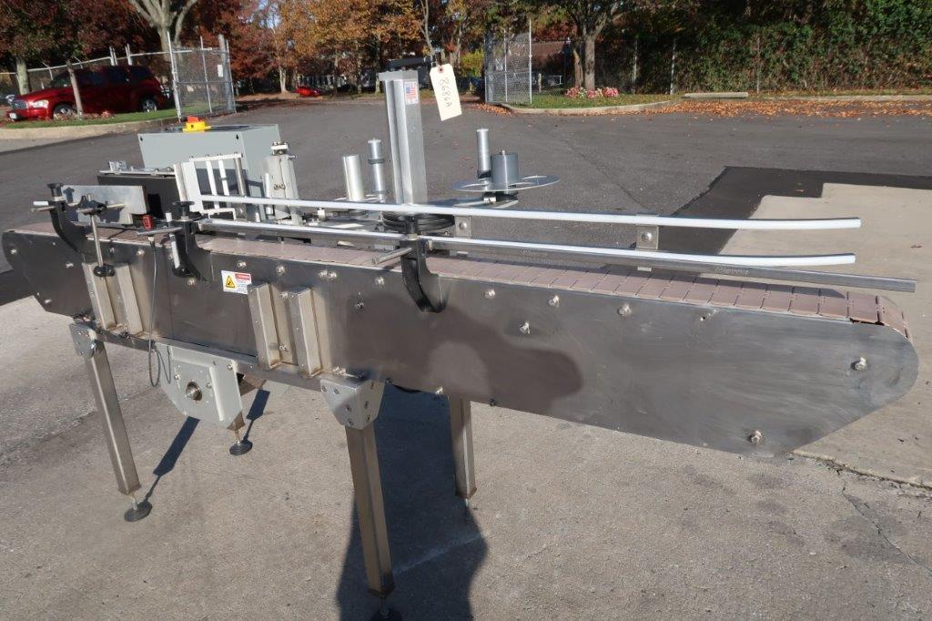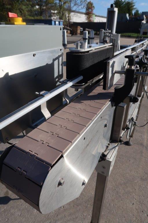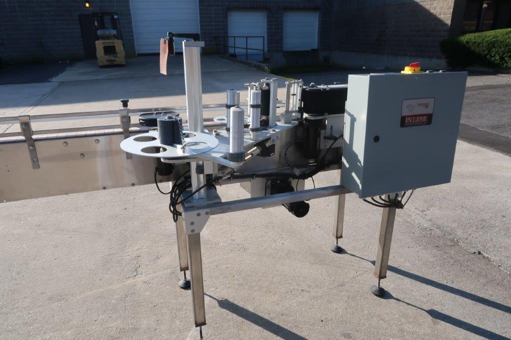 1-Used In-Line Packaging Systems “Paradigm 700” Stainless Steel Automatic Pressure Sensitive Spot/Wraparound Labeling Machine, Serial number P-795. Equipped with timing wheel for synchronizing containers, labeler has 5 inch high wraparound belt. With 4-1/2 inch wide plastic tabletop conveyor chain, machine has push-button starter and was last used in food packaging line. with Single phase electrics (Stock #8686A)