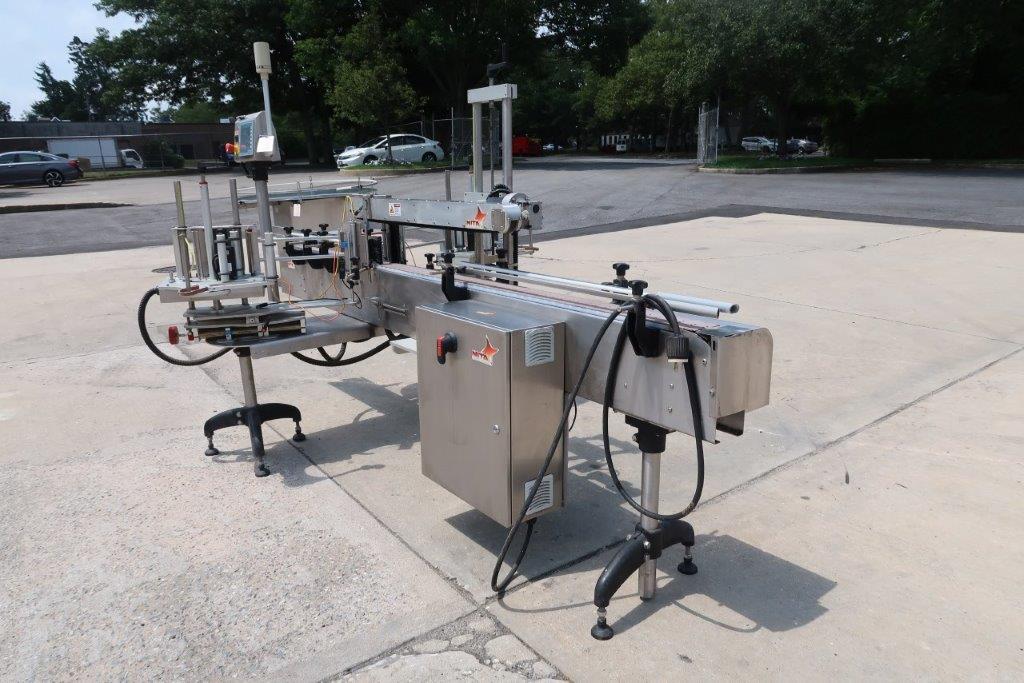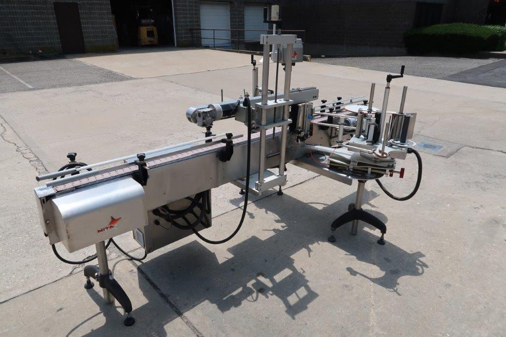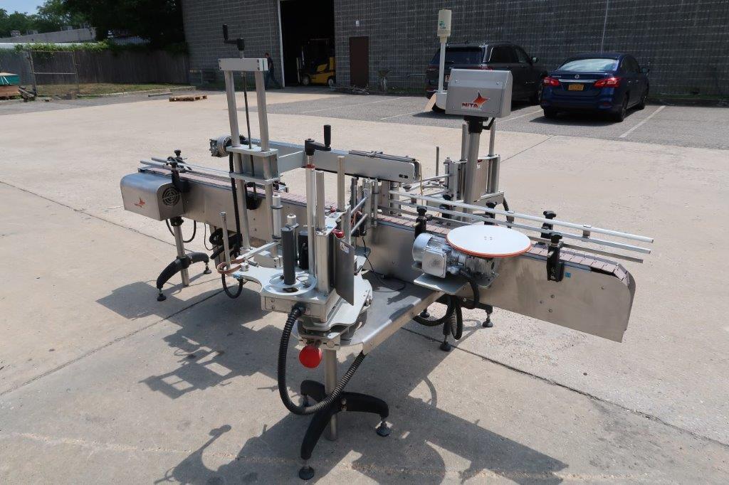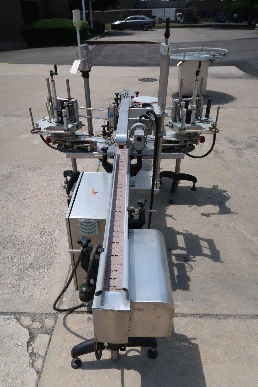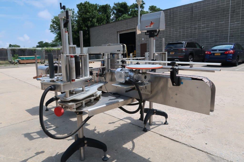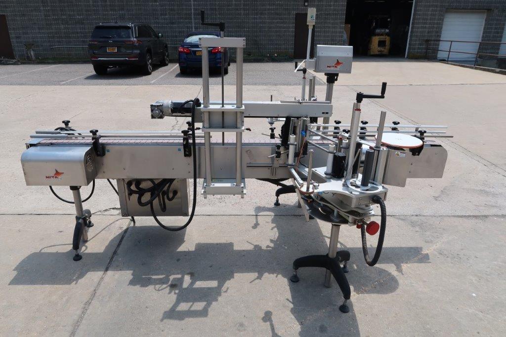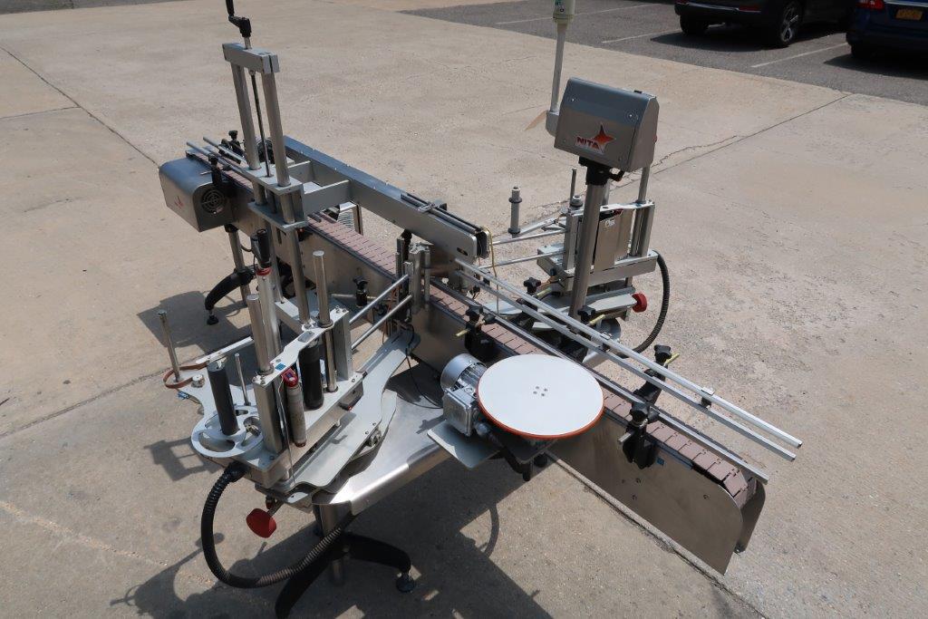 1-Used Nita Model XP200T Automatic Front and Back Pressure Sensitive Labeling Machine, Serial number 412-0608. With top “hold down” belt for stabilizing containers, labeler has stainless steel exterior and motorized timing wheel. With touch-screen control panel, machine has 4 In. wide plastic tabletop conveyor chain and 3/60/208 Volt electrics. Last used for labeling various size plastic juice bottles. Machine is equipped with adjustable labeling heads which tilt allowing labeling of tapered containers, as well as round and square bottles (Stock #8764B)