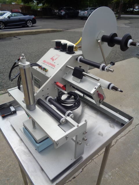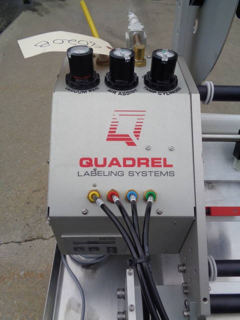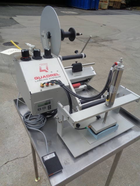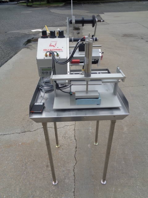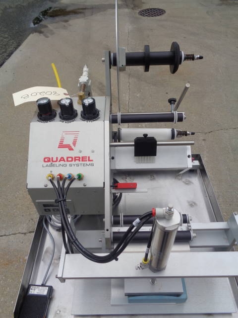 1-Used Quadrel Model T2 Tabletop Semi-Automatic Pressure Sensitive Tamp Labeling Machine, S/N 81826-01.  This foot switch activated Labeler uses single phase, 110 volt electrics and air.  Stainless Steel Table shown in photographs not included.  (Stock #8020B)