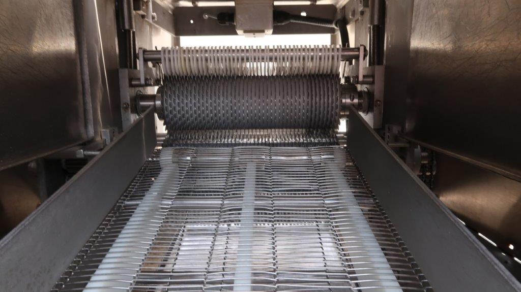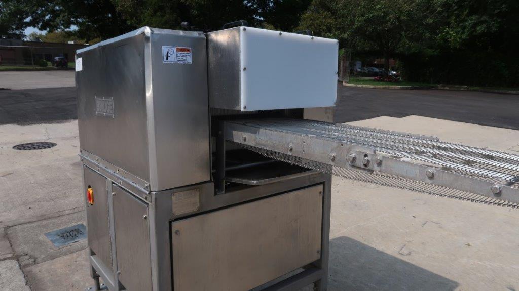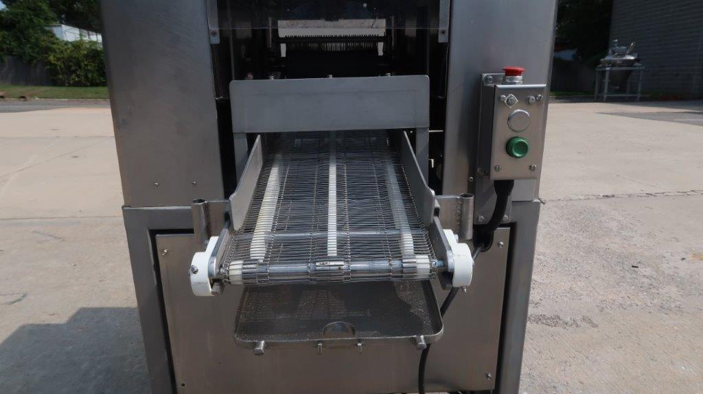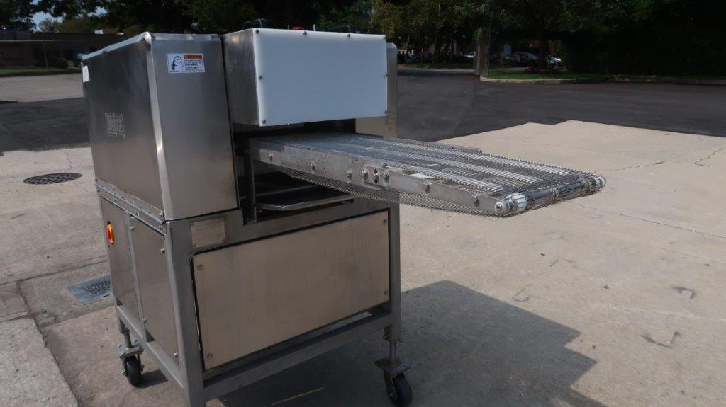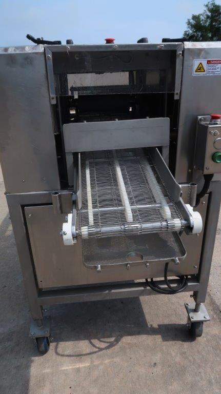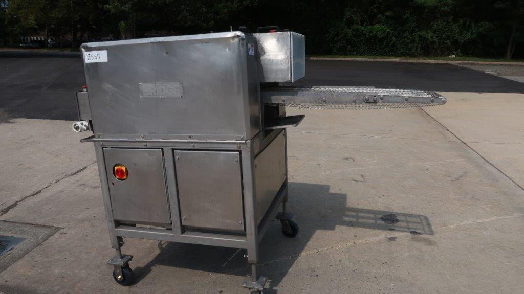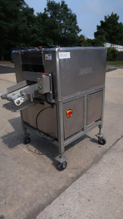 1-Used Bridge Machine Company Model CC-12 Meat Tenderizer, S/N 26476-NN. Equipped with 12 In. wide belt, Machine has stainless steel cabinetry and is on casters for portability. Electrical specifications 3/60/230 Volt. (Stock #8557)