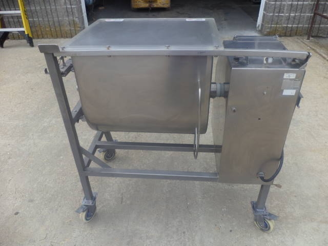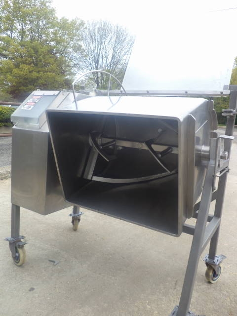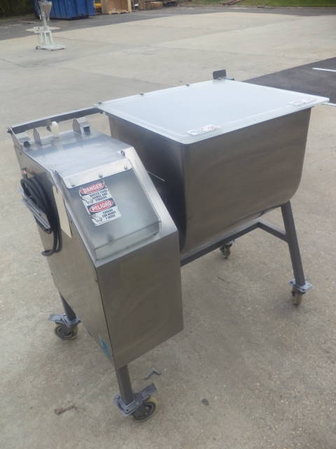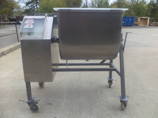 1-Used Daniels Food Equipment Company 200 Lb. Stainless Steel Double Acting Mixer Model DMX-20 QUAD. On casters for portability, bowl dimensions approx. 20 in. wide X 25-1/2 in. long X 23 in. deep. With tilt discharge, Blender also has bottom center drain and driven by 1.5 HP 3/60/230 volt motor. Agitator RPM 24. With hinged lid. (Stock #7997A)