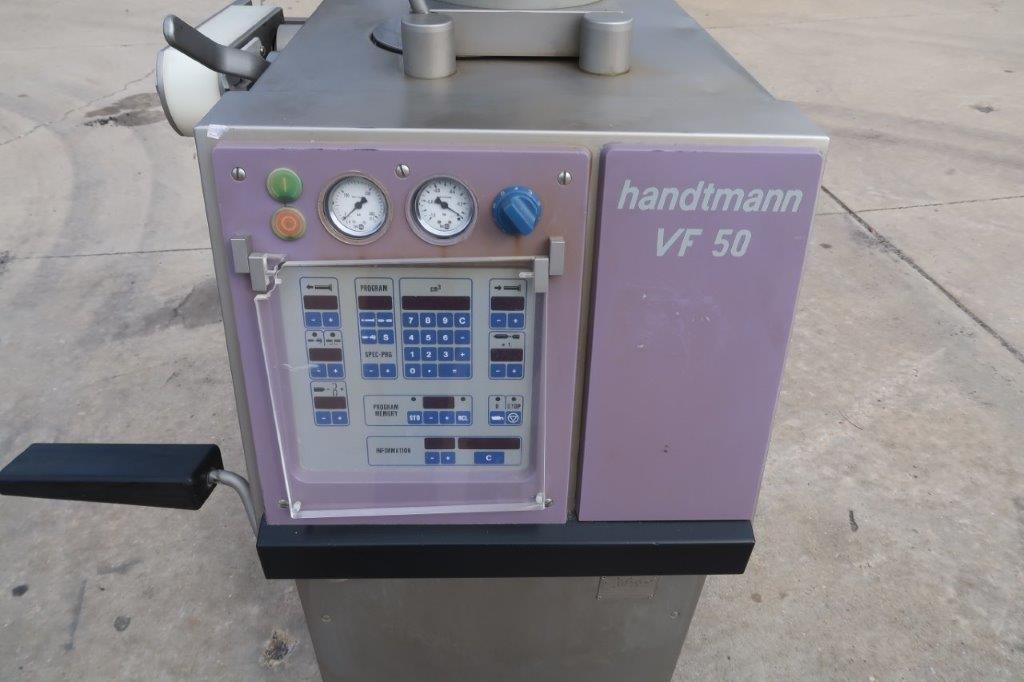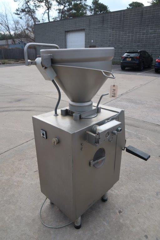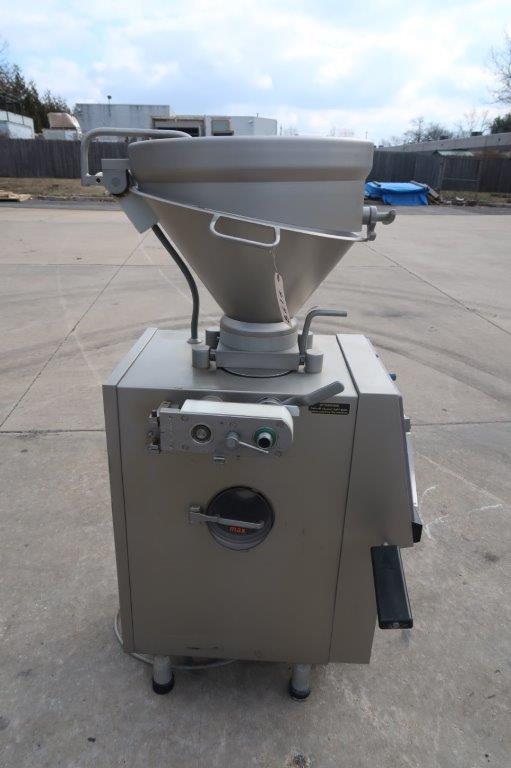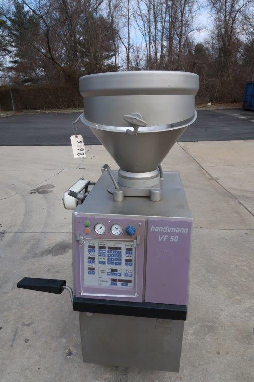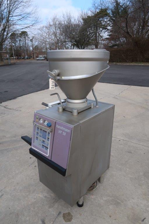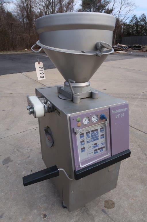 1 – Used Handtmann Model VF50 Vacuum Filler/Stuffer, S/N 16364. With front mounted Micro-Computer with gauges and controls, machine rated up to 2,400 kg/hr. With top mounted 21 In. diameter product hopper, machine is capable of up to 300 portions per minute.  Suitable for products such as mince and sausage meat, cookie dough, as well as many other products. ( Stock # 8616)