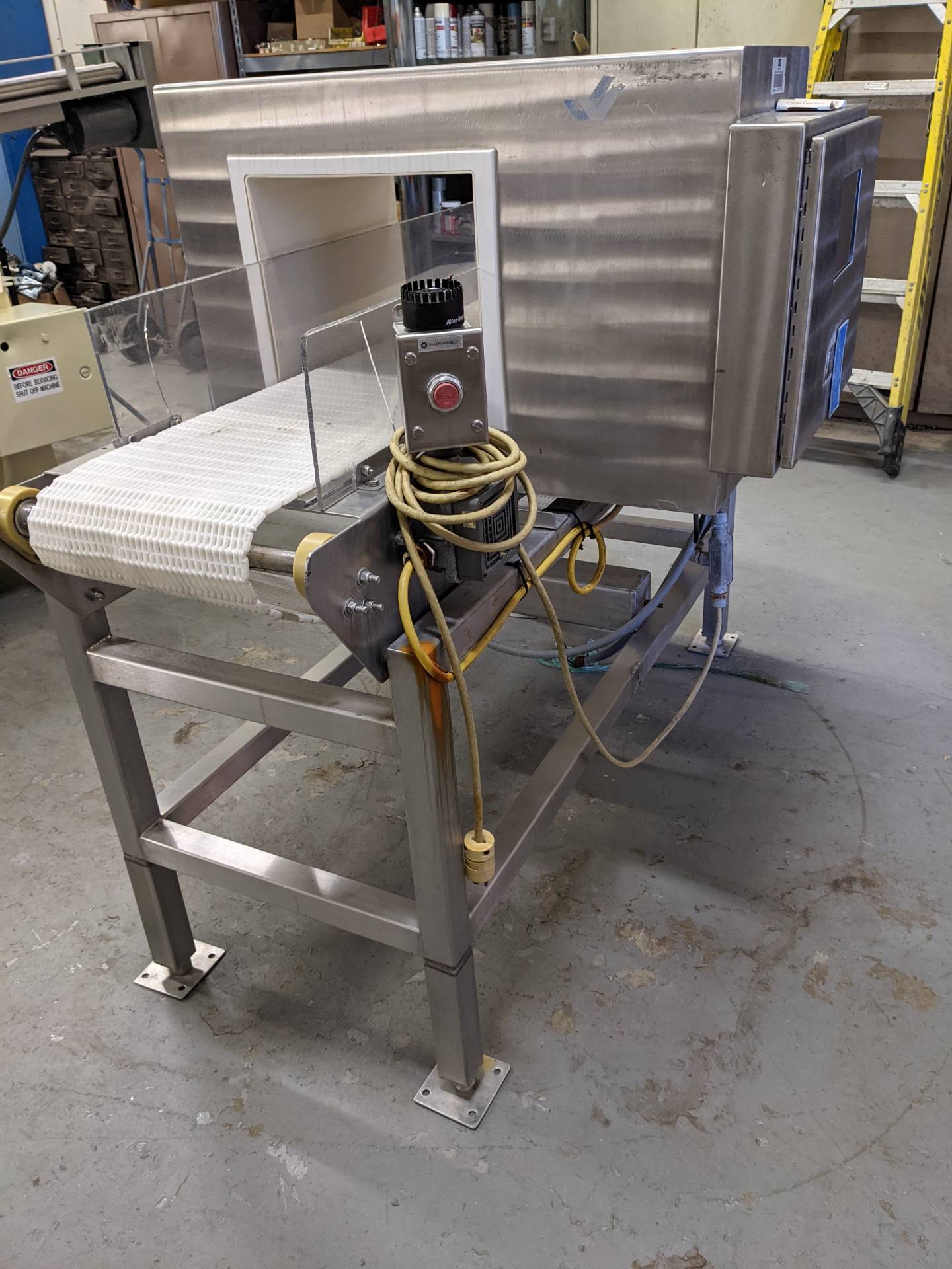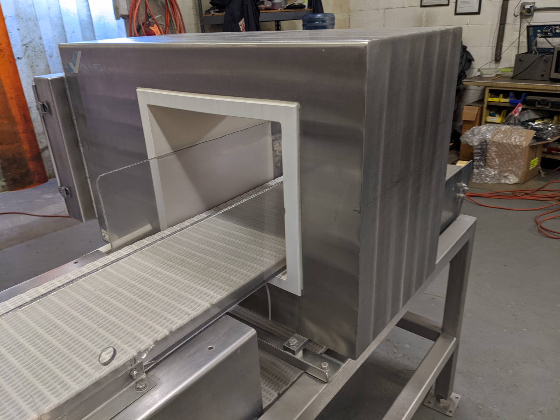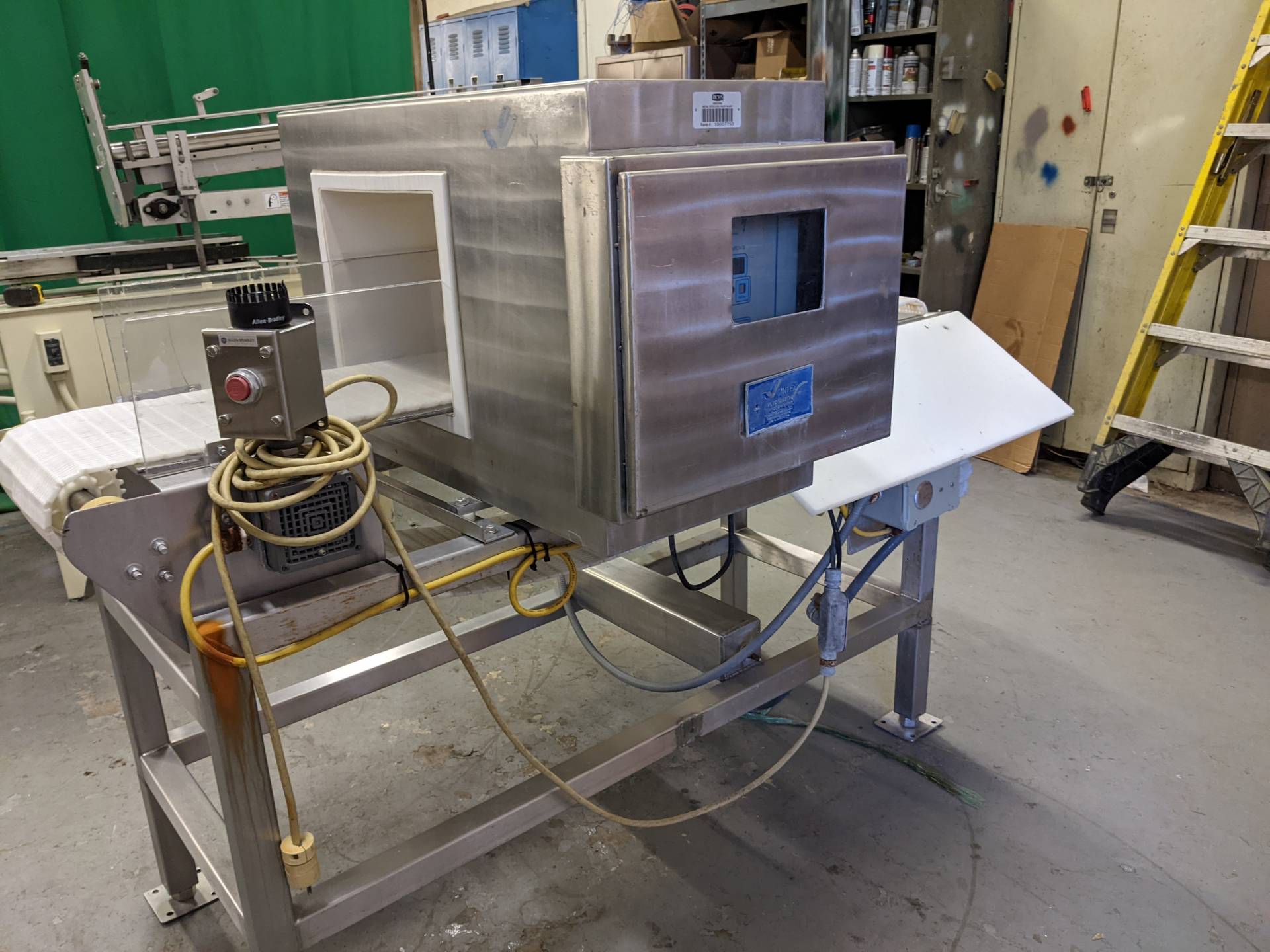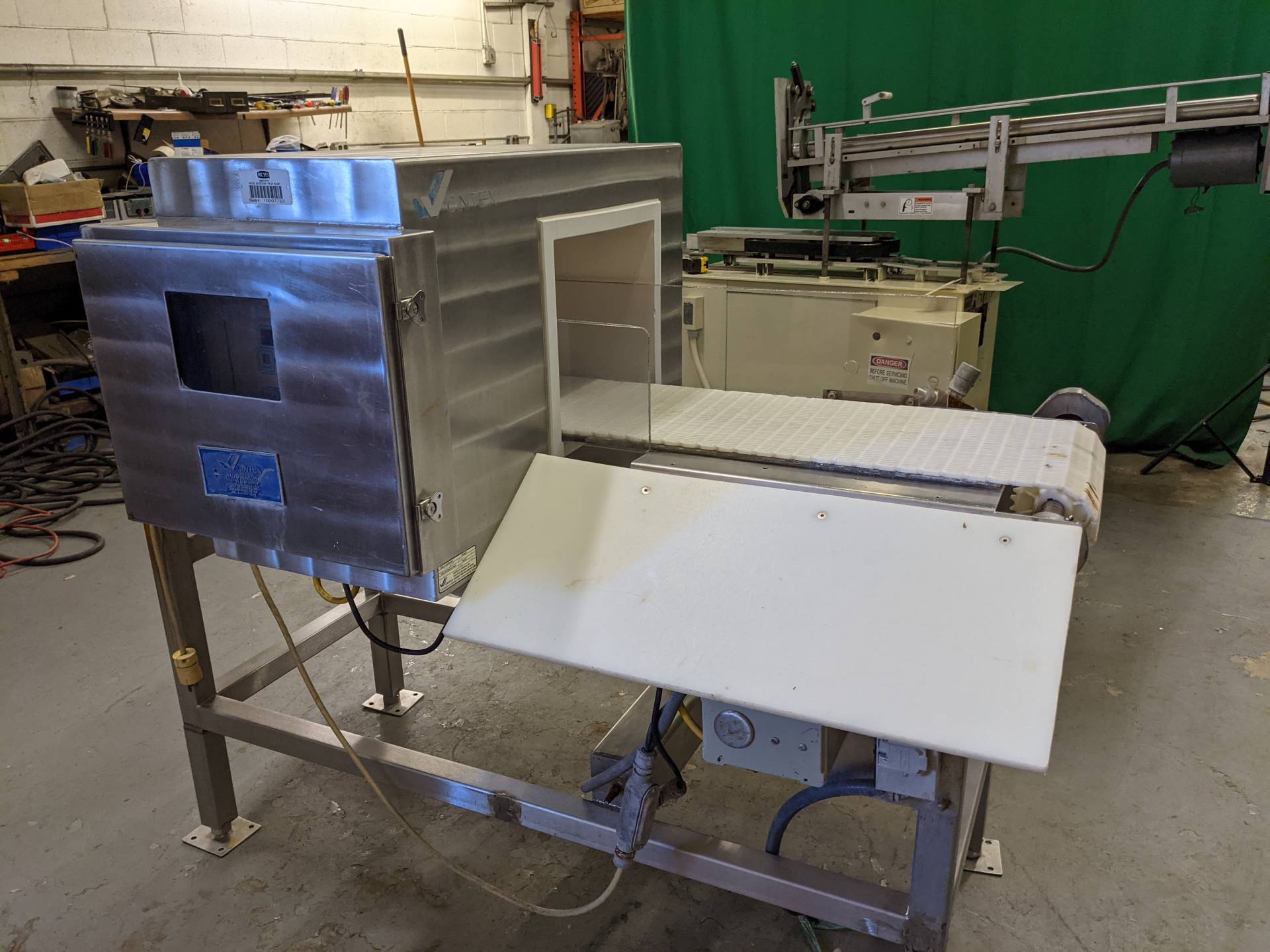 1-Used Cintex Autosearch Stainless Steel Metal Detector, S/N 39681 1412. This conveyorized metal detector has an aperture measuring 13 3/4 In. Wide x 10 7/8 In. High. Mounted on stainless steel base, machine was last used on the meat industry. (Stock #8565A)