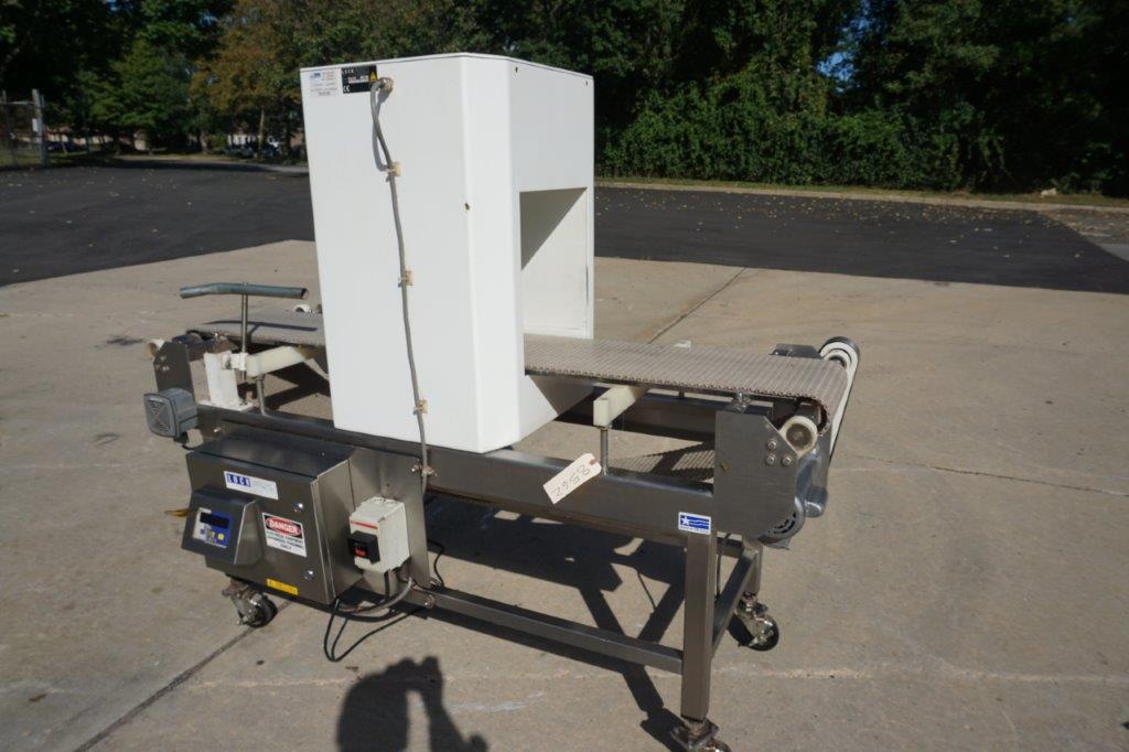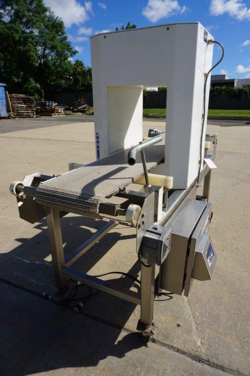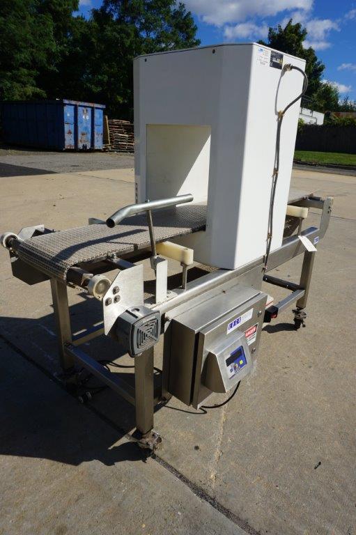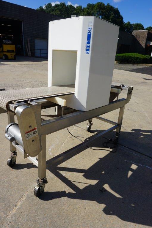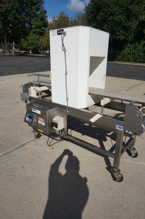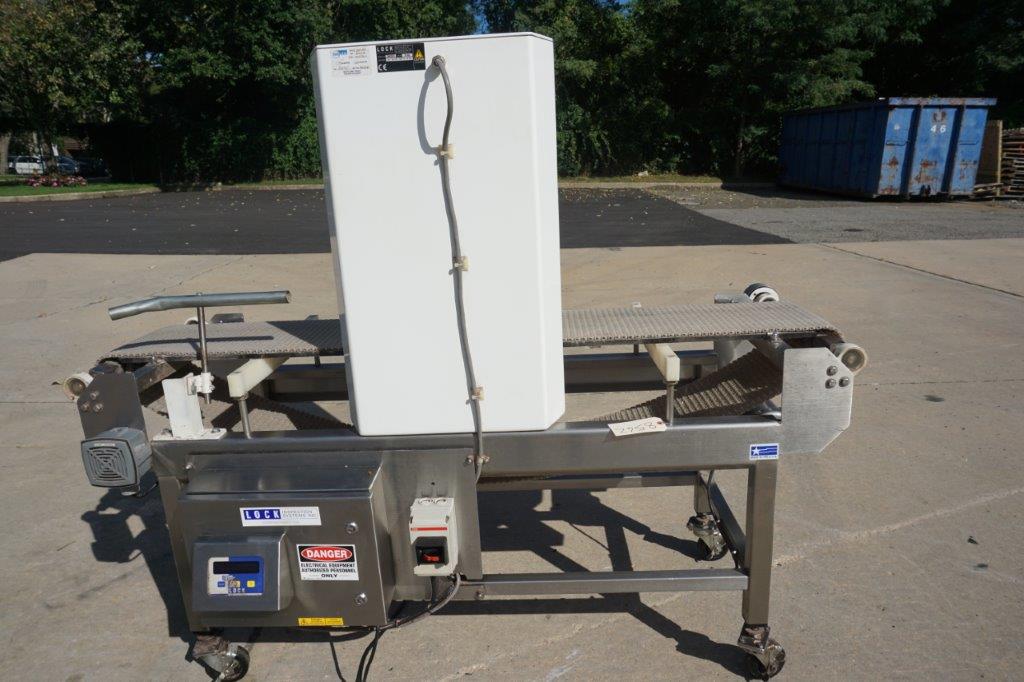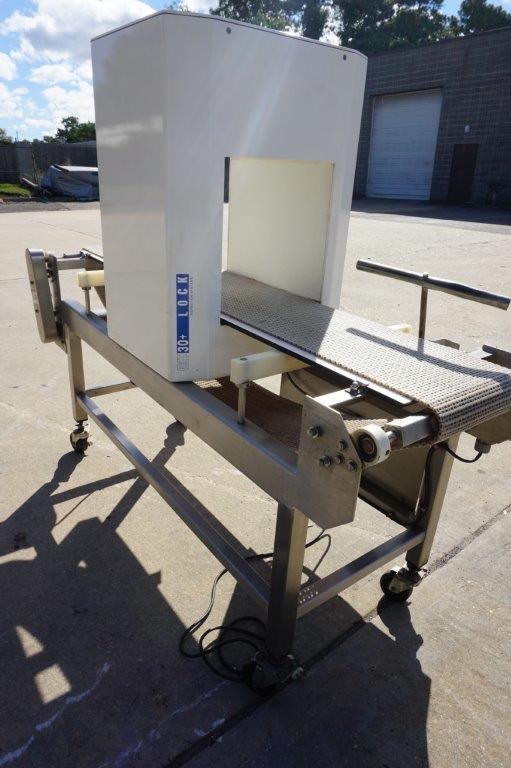 1-Used Lock MET30+ Conveyorized Metal Detector, S/N 30693/1. Equipped with 14 In. Wide X 15 In. High aperture, machine is on stainless steel stand with casters for portability. Last operated in food processing, machine has single phase electrics. (Stock #8562)