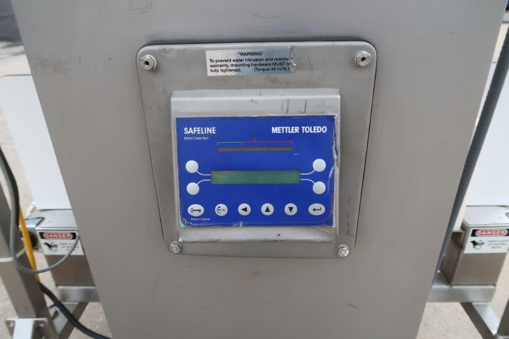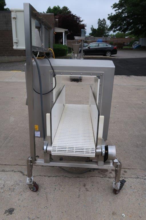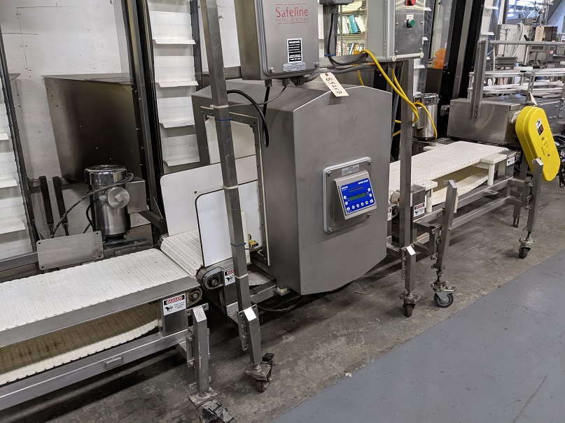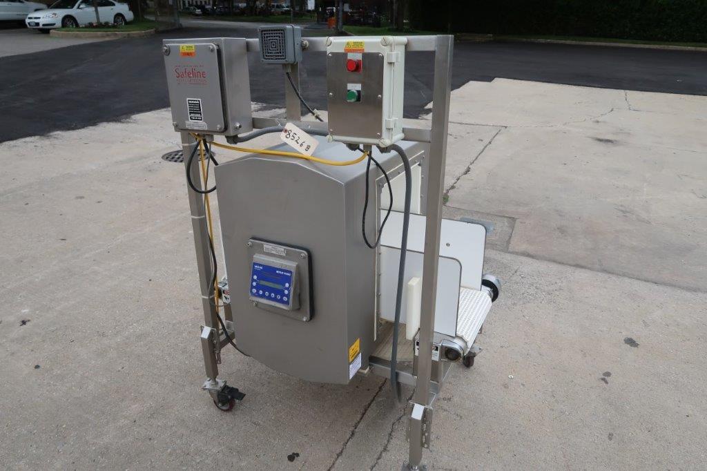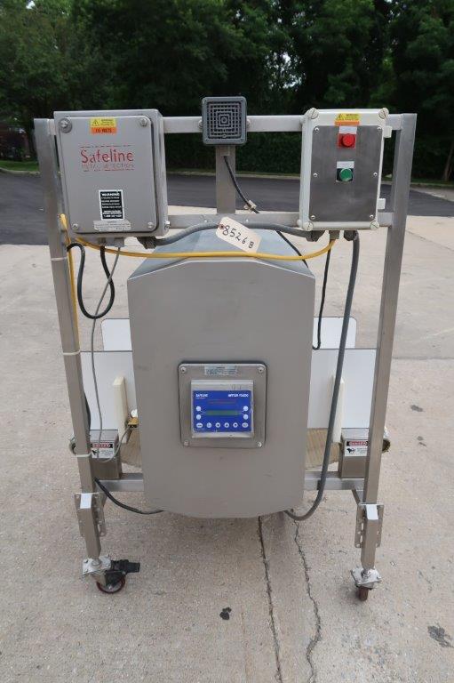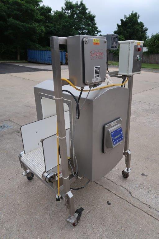 1-Used Safeline Conveyorized Metal Detector, Reference Number 10182-01. Mounted on stainless steel base with casters. Aperture approx. 14 In. Wide x 21 In. High. Equipped with digital control panel. Driven by an Approx. 1HP, 110 Volt, single phase motor, this metal detector can be supplied with infeed and discharge conveyors, shown in photo, at additional cost. (Stock # 8526B)