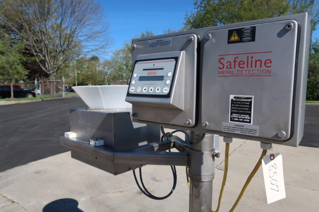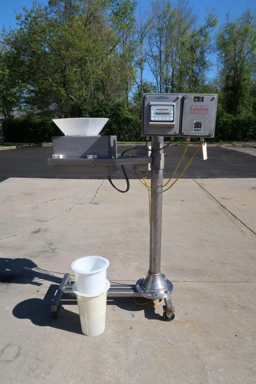 1-Used Safeline Gravity Flow Metal Detector, Model GF-V3-SS, S/N 59169. With 10 In. diameter aperture, machine is mounted on Stainless Steel portable stand with casters. With single phase electrics. (Stock# 8507)
