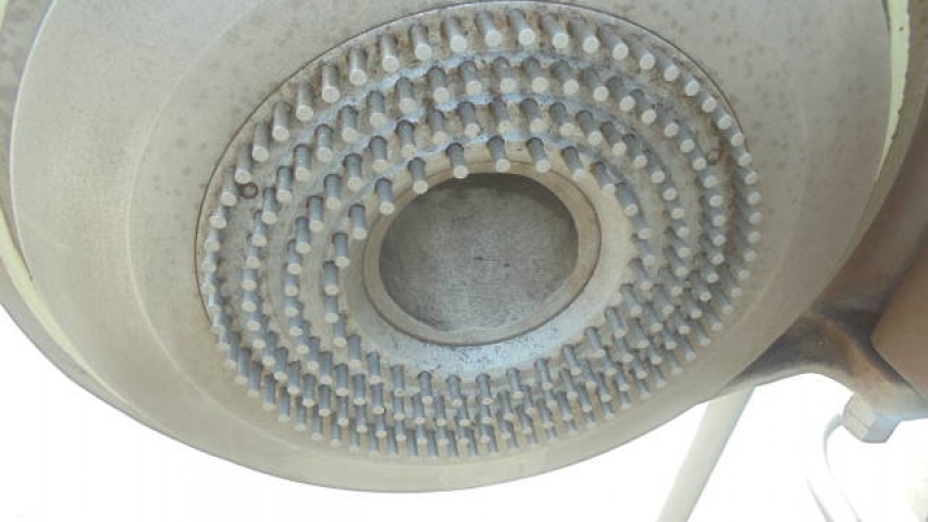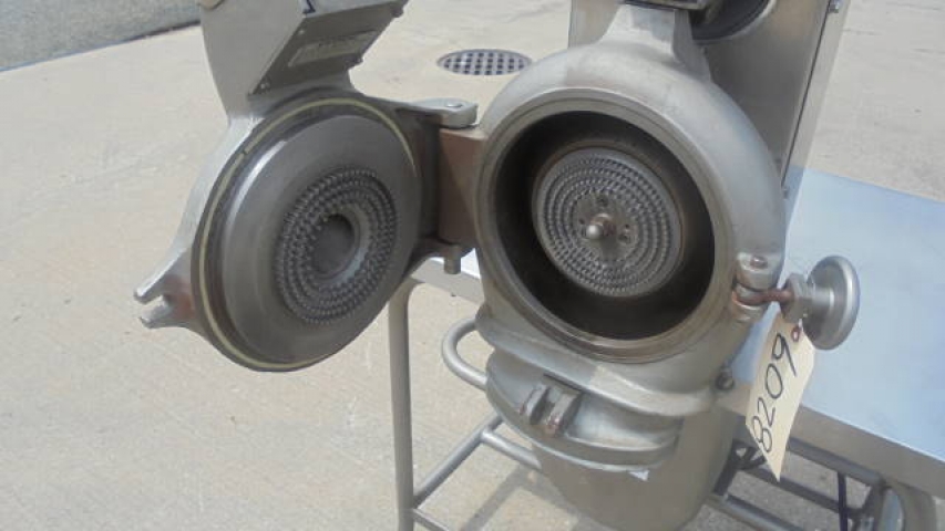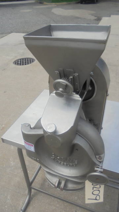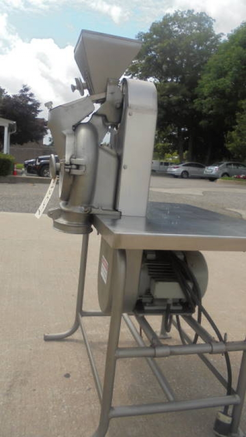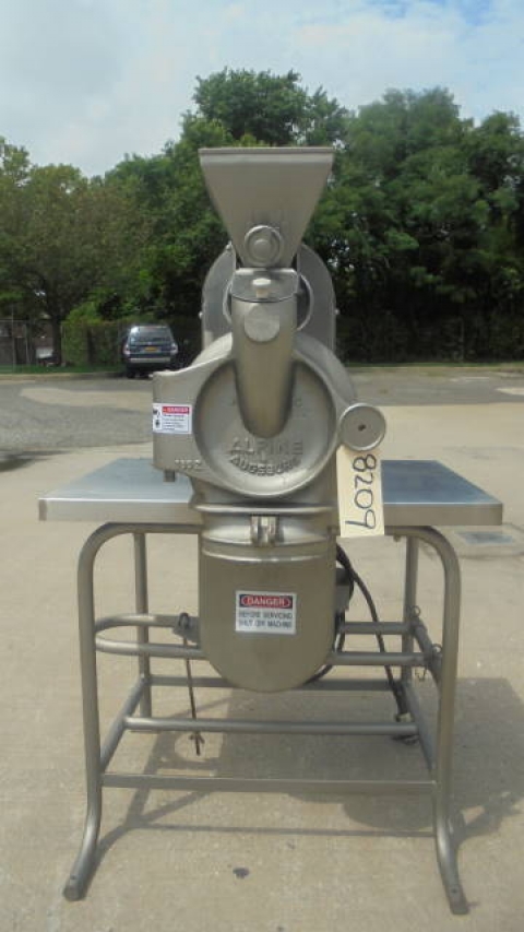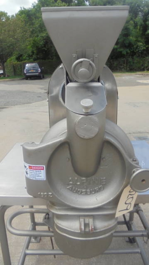 1-Used Alpine Model 160-Z Impact Stud/Pin Mill. Equipped with “pin style” grinding chamber, machine is driven by 5HP 3/60/230-460 volt electric motor. Mounted on table with stainless steel tabletop, machine has top mounted stainless feed hopper. (Stock #8209)
