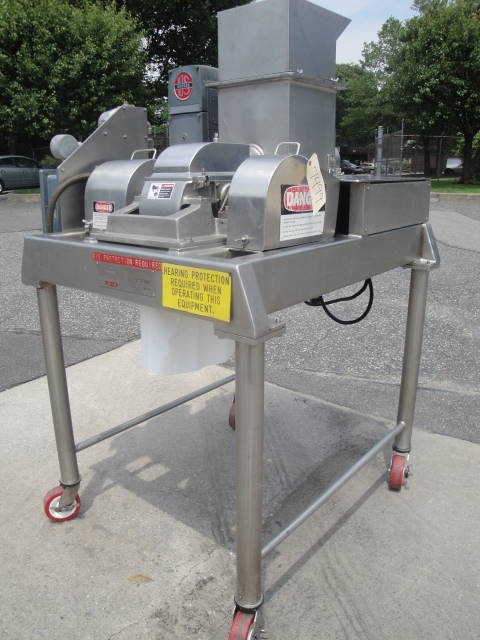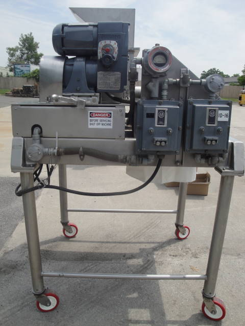 1-USED FITZPATRICK MODEL DAS06 STAINLESS STEEL COMMINUTOR/PULVERIZER, S/N D6-6909. THIS EXPLOSION PROOF MACHINE HAS STAINLESS STEEL FIXED BLADES, SHARP ON ONE SIDE AND BLUNT ON REVERSE SIDE. ON PORTABLE STAINLESS STEEL BASE, WITH STAINLESS STEEL TUBULAR LEGS WITH CASTERS. THIS UNIT HAS 10 HP MAIN DRIVE MOTOR, AS WELL AS FRACTIONAL HORSEPOWER ACCESSORY MOTOR FOR DRIVING THE HORIZONTAL PRODUCT FEED SCREW 3/60/230-460 VOLT VARIABLE SPEED. WITH TOP MOUNTED STAINLESS STEEL HOPPER, MACHINE HAS TWO (2) ALLEN BRADLEY EXPLOSION PROOF STARTER BOXES, AS WELL AS EXPLOSION PROOF AMMETER. (STOCK # 7494)