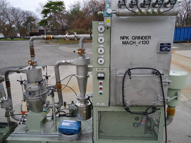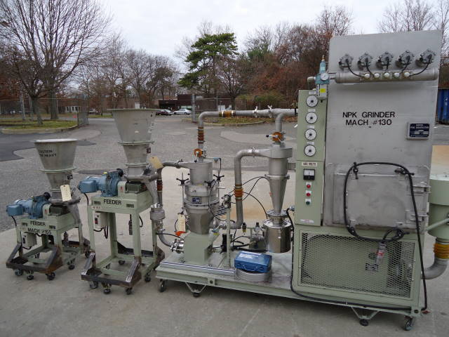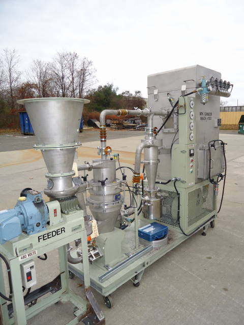 1-Used npk pilot plant type pjm-1ds-2 “supersonic” jet mill, s/n 1-02400. With stainless steel contact parts, this jet mill is supplied with two (2) npk excent stainless steel portable feeders with variable speed motors. Entire system is mounted on portable base with casters, along with npk bag filter/collector with gauges, controls, etc. (stock #7422c)