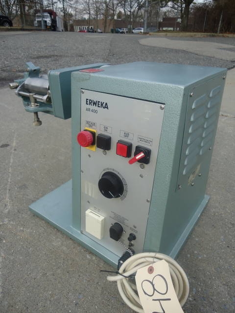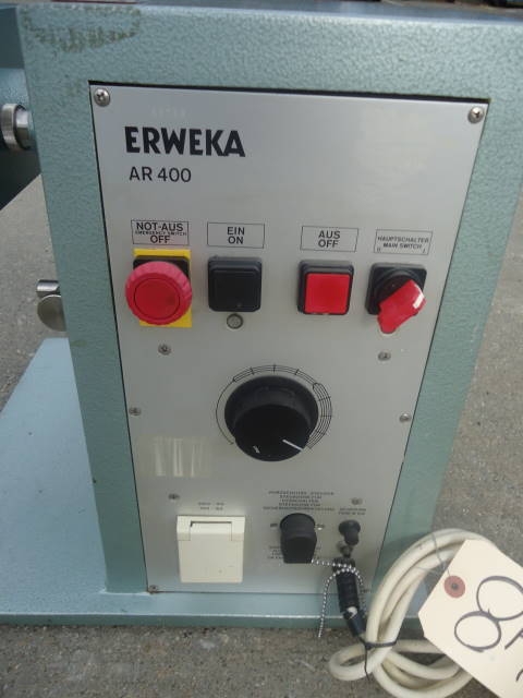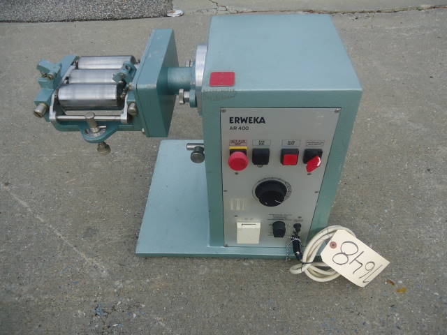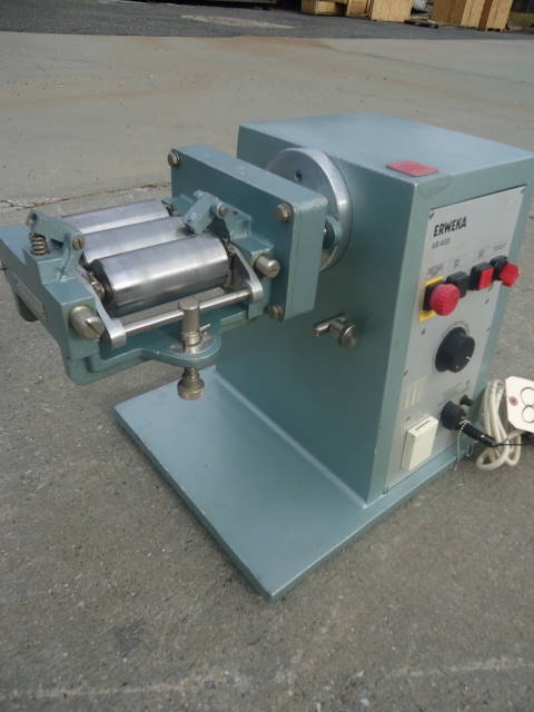 1-USED ERWEKA TABLETOP LAB THREE ROLL MILL TYPE SMS, S/N 43744.  EACH ROLL MEASURES APPROX. 2 IN. WIDE X 4-1/2 IN. LONG.  DRIVEN BY ERWEKA MODEL AR 400 DRIVE UNIT.  110 VOLT.  (STOCK # 7648)