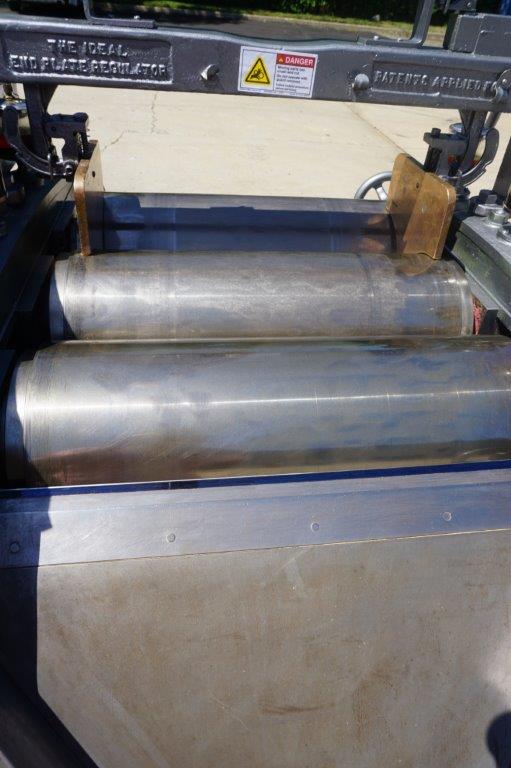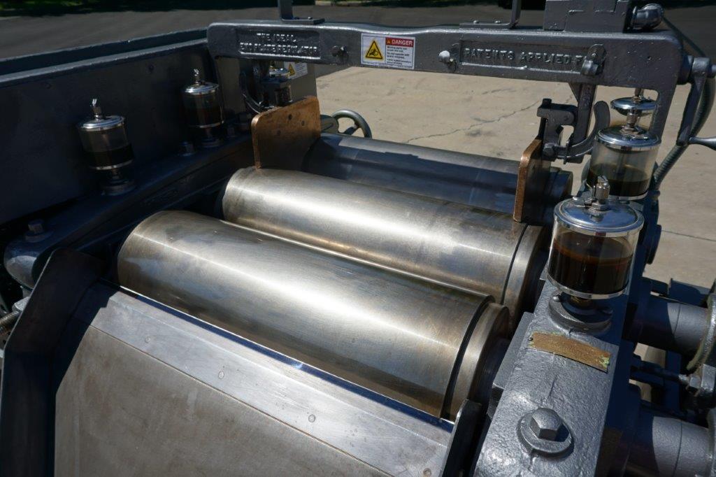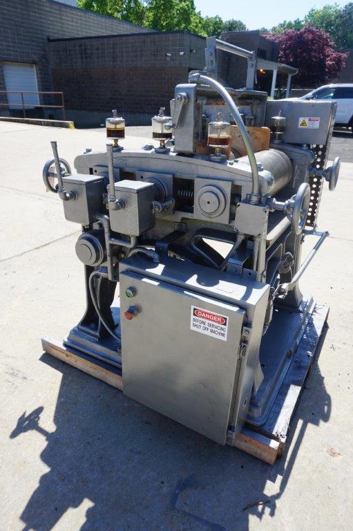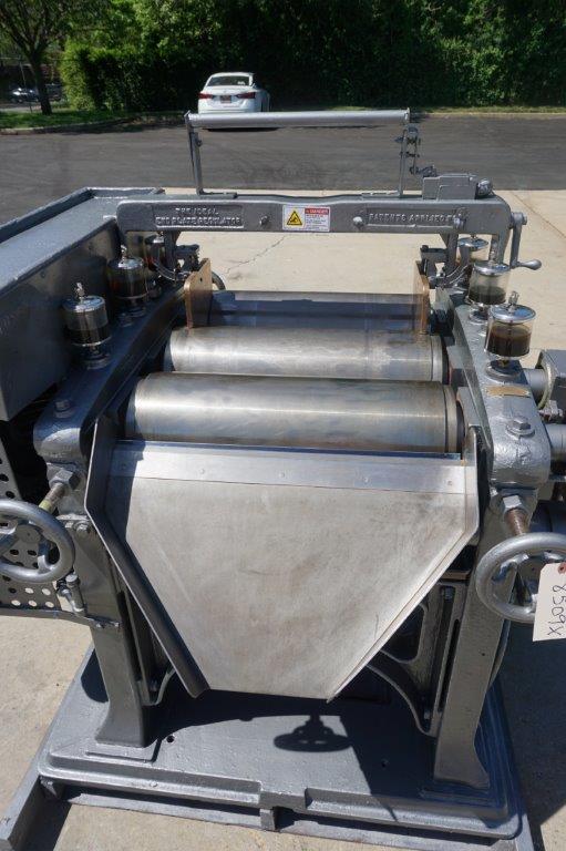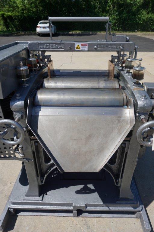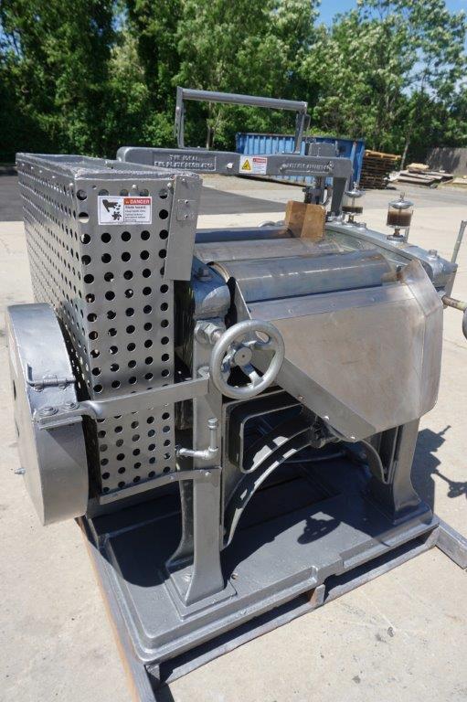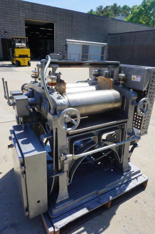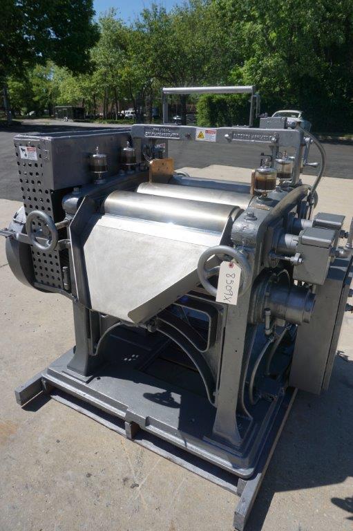 1-Used Kent 8 In. X 24 In. Three Roll Mill. Last used in the cosmetics industry, machine has end guides and apron for discharge. Driven by 5HP, 3/60/230-460 Volt motor. (Stock #8509X)