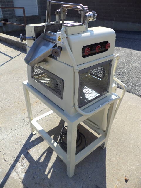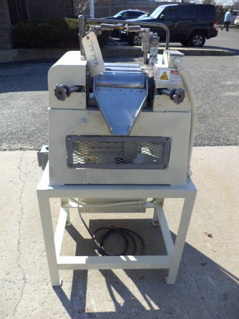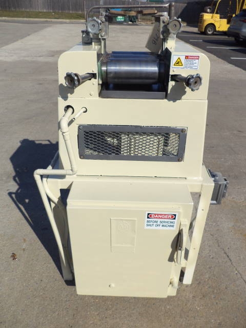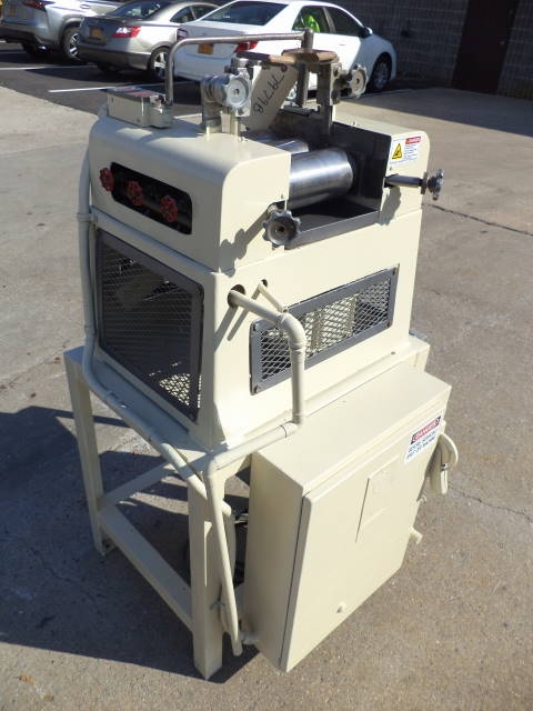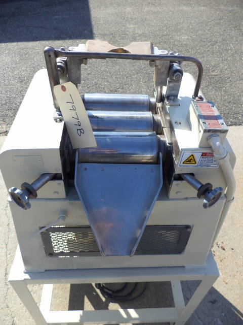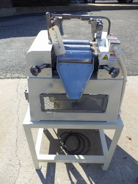 1-Used Ross 4 In. X 8 In. Lab Three Roll Mill, S/N 24060.  Mounted on table, Mill has apron and end guides and driven by explosion proof motor.  Equipped with safety shut off.  (Stock #7979B)