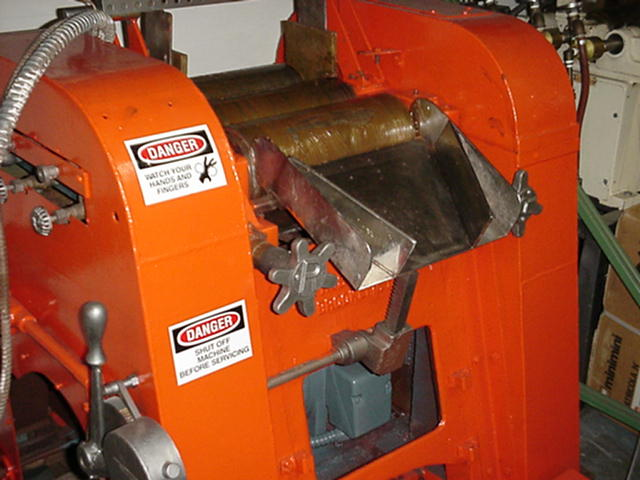 1-USED ROSS THREE ROLL MILL, ROLLS 6" DIAMETER BY 14" LONG. WITH END GUIDES, APRON/KNIFE ASSEMBLY AND 5HP DRIVE MOTOR. LAST USED AT COSMETICS MANUFACTURER.
