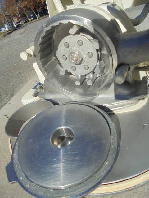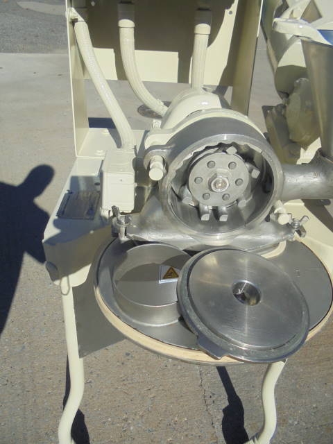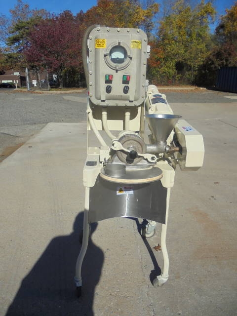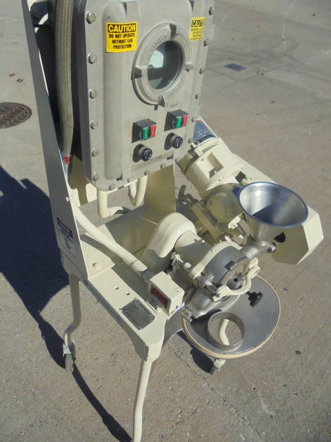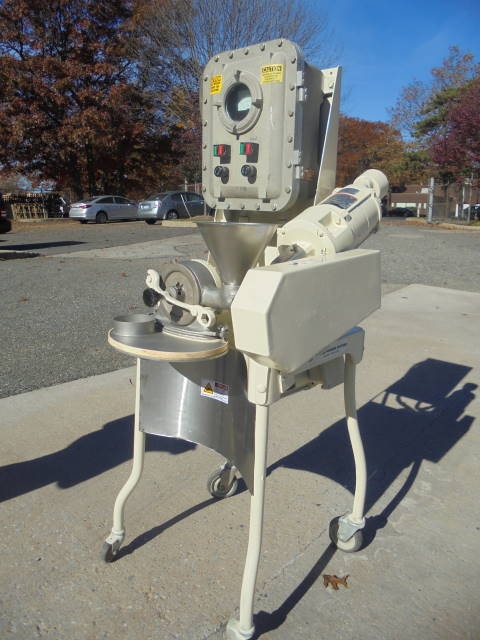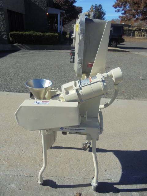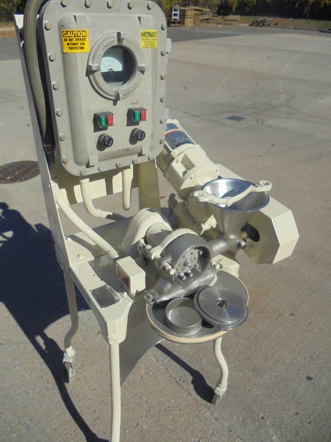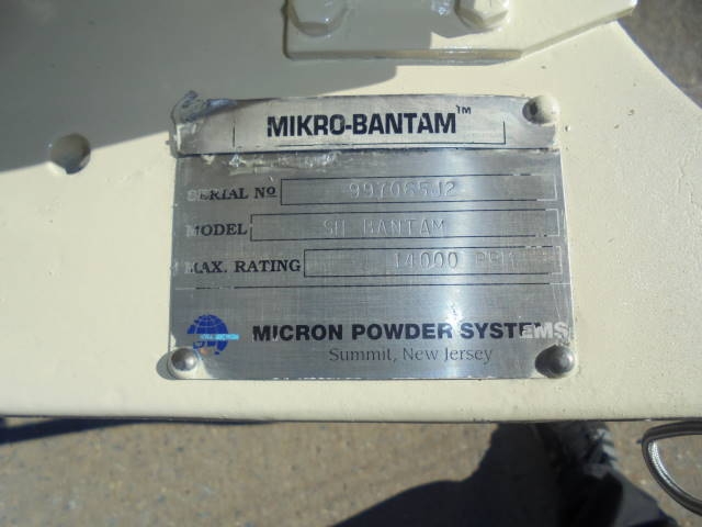1-Used Hosokawa Micron Powder Systems “Mikro” Bantam SH Lab Pulverizer/Hammermill, S/N 99706552. Equipped with stainless steel free swinging stirrup type hammers driven by 1 HP 3/60/208-230-460 volt explosion proof motor. Machine has approx. 8 in. diameter Stainless Steel Conical Feed Hopper and Product Screw Feeder driven by 1/3 HP 3/60/ 208-230-460 volt explosion proof motor. On portable stand with casters, Mill has explosion proof ammeter and is equipped with stainless steel screen. (Stock #8045)