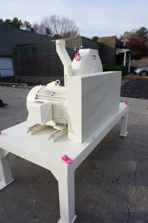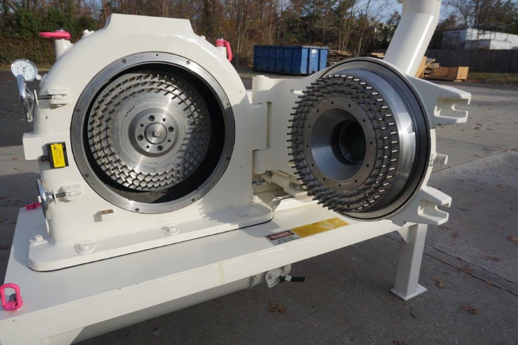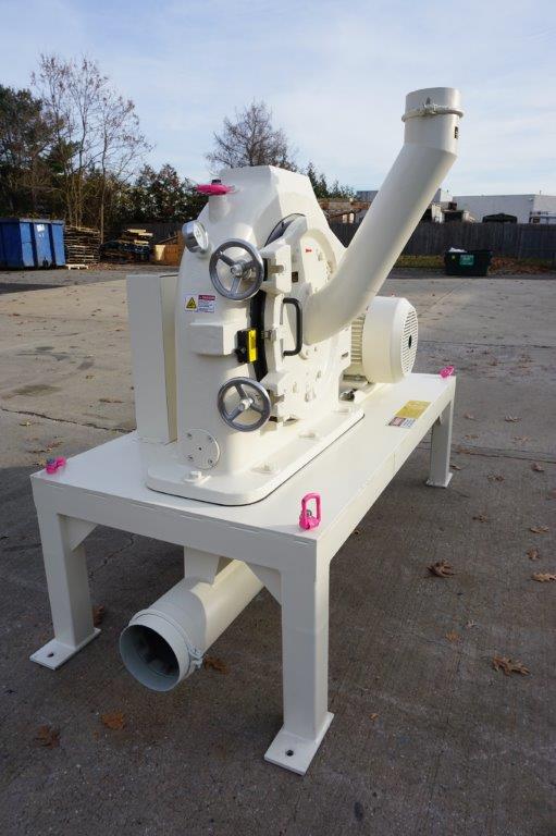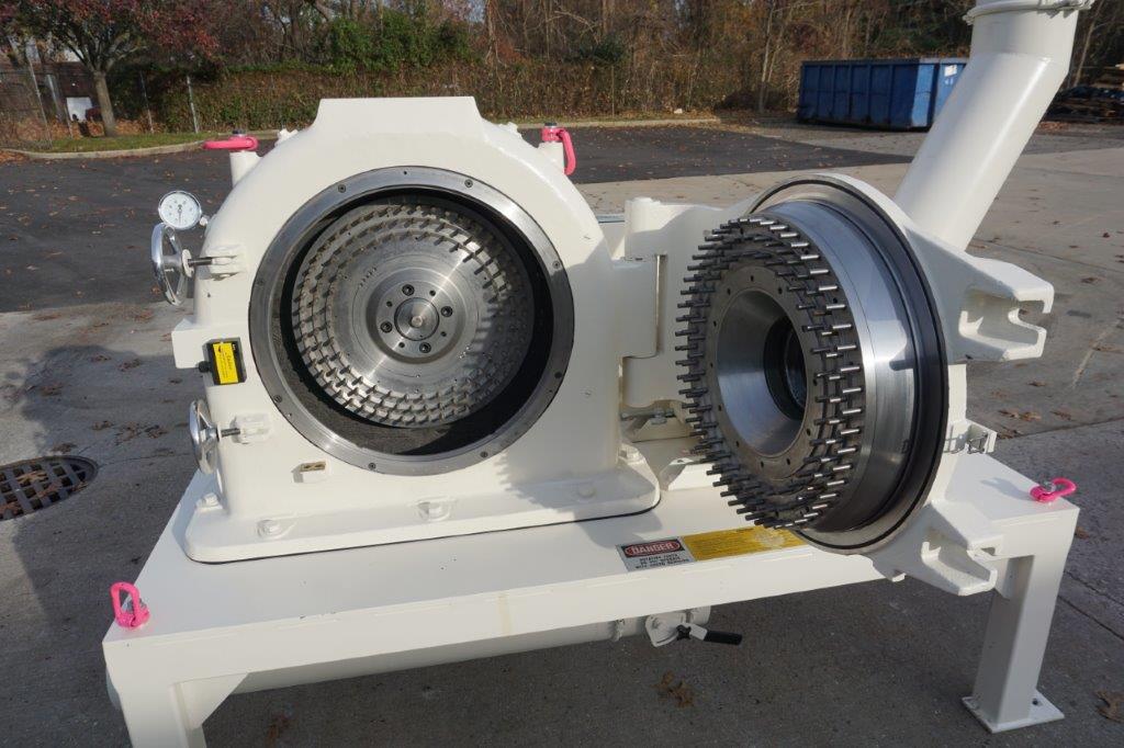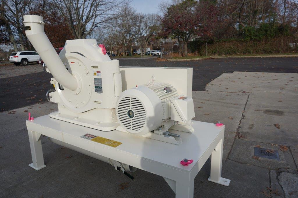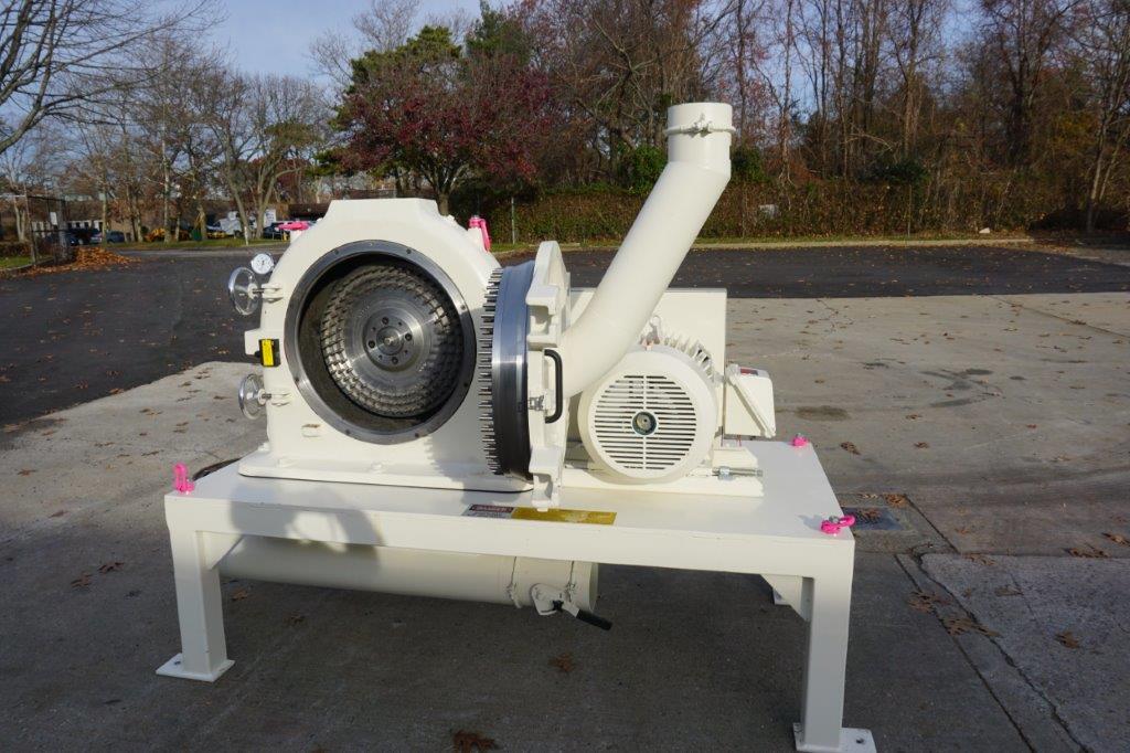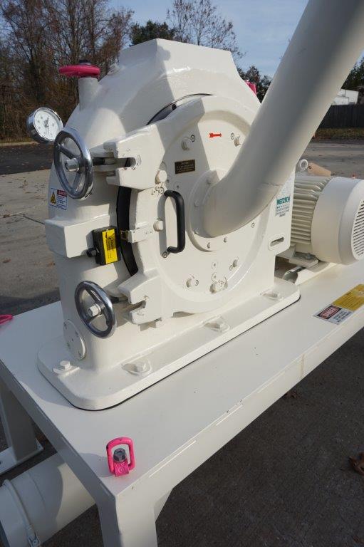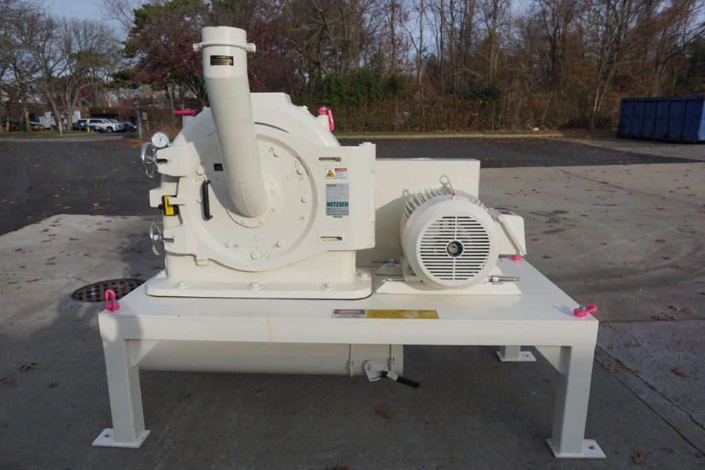 1-Unused Netzsch Type CUM 450/CST Pin Mill, Machine Number 7743, Order number 200296. Originally purchased for use in the sugar industry, machine was never put in production, so it remains in unused condition. This high-speed stud impact mill is mounted in stand and driven by Reliance 50HP, 3/60/460 Volt motor. (Stock #8586)