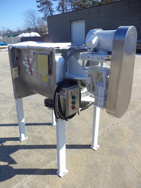 1-Used Marion 10 cu. ft. working capacity stainless steel paddle blender, Model FP2436, S/N 83036. Interior tank dimensions approximately 24 inch wide by 36 inch long by 28 inch deep. With two piece stainless steel cover, blender has 5 inch diameter center bottom discharge with “butterfly” style valve. With stainless steel starter box, blender has top mounted drive motor and shaft mounted speed reducer. Last utilized in food production. (Stock# 7871A)
