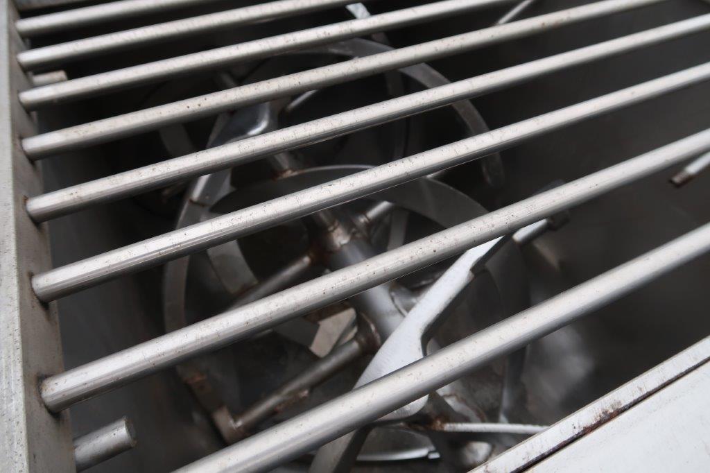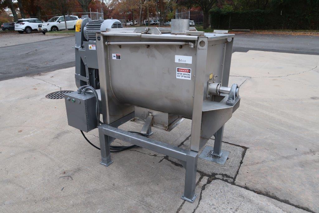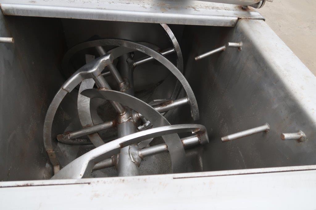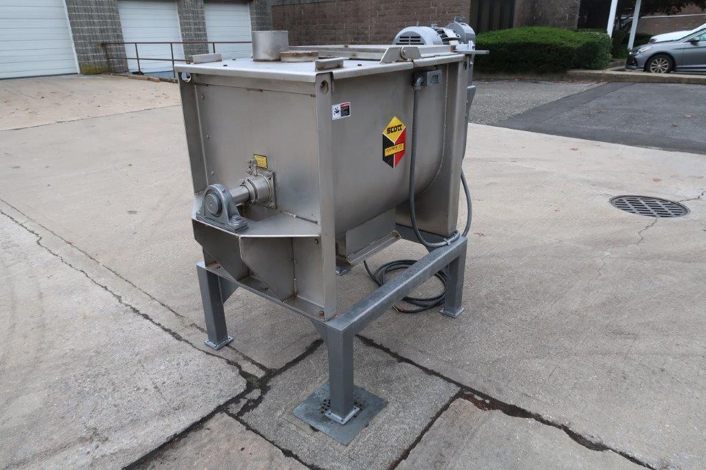 1 – Used Scott Equipment Approximately 10 Cu. Ft. Scott Stainless Double Ribbon Blender, Model SHRM 243SS, S/N 9611242. The interior tank dimensions are approximately 30 In. wide X 36 In. long by 28 In. deep. With a stainless steel cover and stainless safety grate, the blender has an approx. 6 In. diameter center bottom discharge with hand-operated valve. With starter box, blender 7.5 HP 3/6/230-460 Volt Explosion Proof Motor. (Stock # 8800)