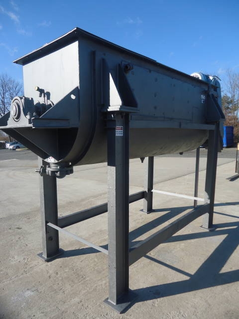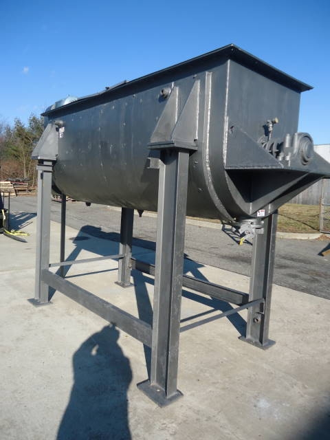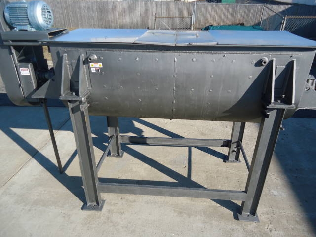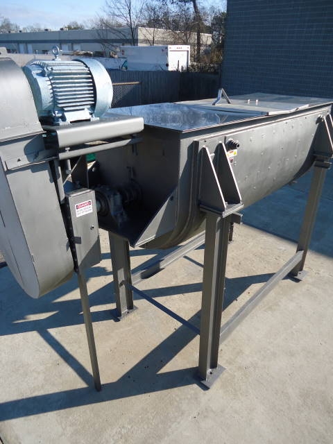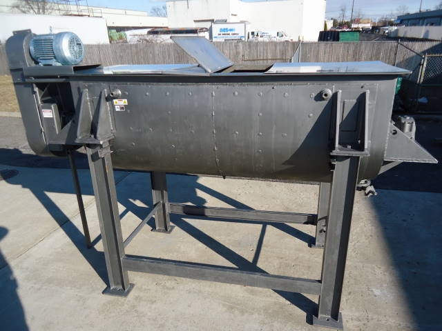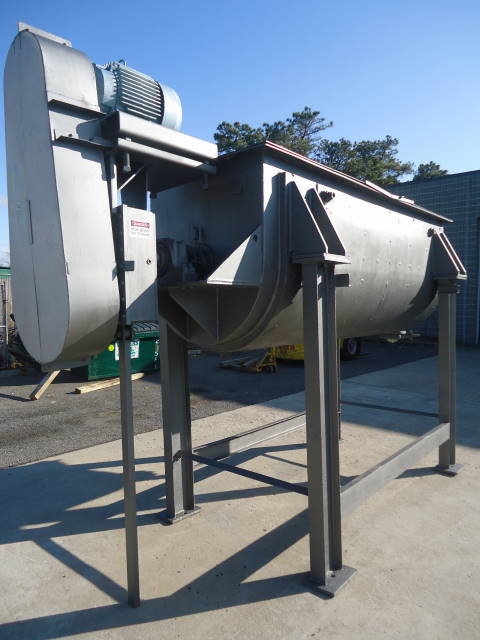 1-Used approx. 100 cu.ft. Stainless steel jacketed double ribbon blender. Tank dimensions approx. 40 in. Wide x 120 in. Long. This jacketed blender is driven by reliance 25 hp 3/60/230-460 volt motor and falk shaft mounted speed reducer. On legs providing for approx. 46 in. Underclearance, blender has approx. 6 in. Diameter outlet with butterfly discharge valve. With outboard anti-friction bearings. (stock #7546b)
