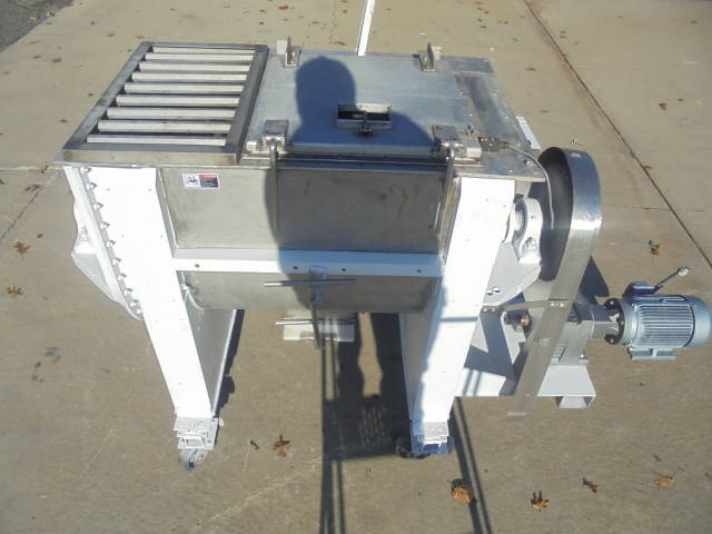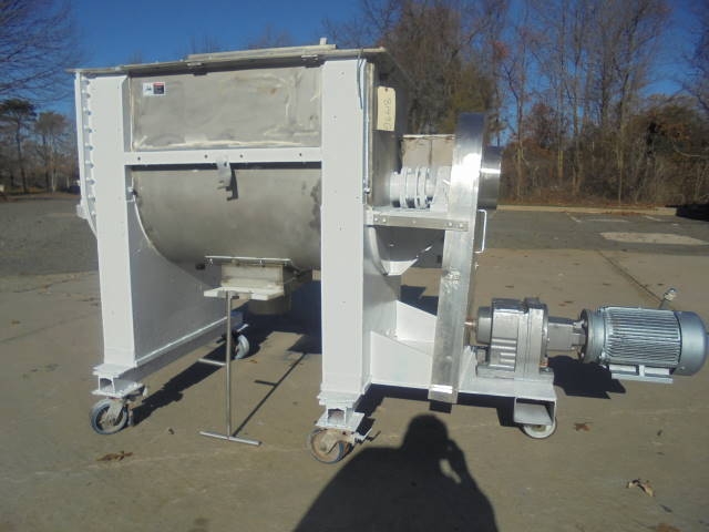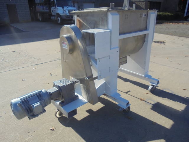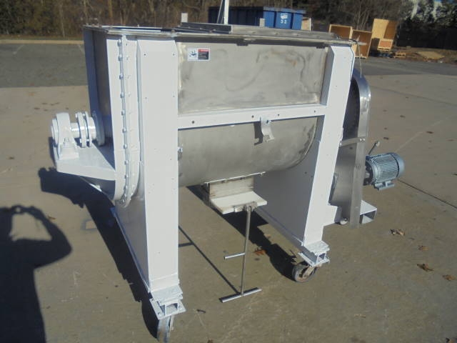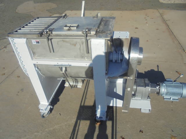 1-Used Approximately 15 Cu. Ft. Stainless Steel Double Ribbon Blender. Trough dimensions approx. 29 in. Wide x 48 in. Long x 34 in. Deep. On portable base with casters, unit has rectangular center bottom discharge and top lid with hinged door. Last used in food facility, blender is roller chain driven by 10HP 3/60/208-230/460 volt motor and speed reducer (Stock #8149G)