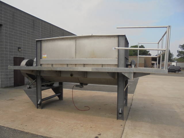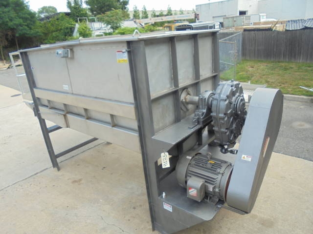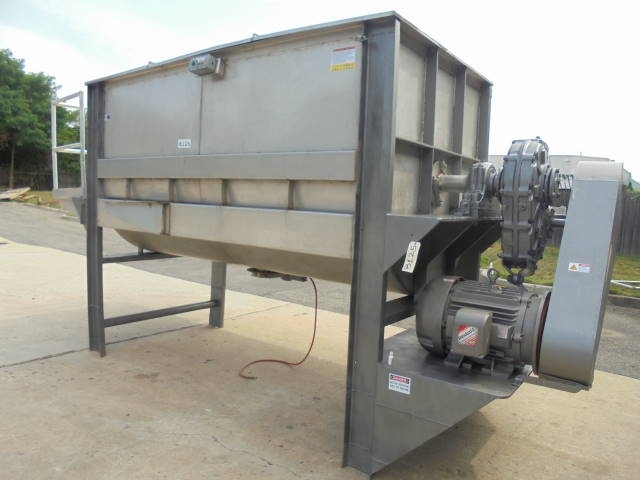 1-Used 200 Cu.Ft. Stainless Steel Double Ribbon Blender. Trough dimensions approx. 60 in. wide X 121 in. long X 64 in. deep. With polished interior, Blender has sectional stainless steel lid and safety grate. With 8 in. diameter center bottom discharge outlet with air operated butterfly style valve. Driven by 40 HP 3/60/230-460 volt TEFC main drive motor through Dodge Shaft Mounted Speed Reducer, Blender on legs and has leg extensions available as well. With outboard bearings, inner ribbon measuring approx. 2-1/2 in. wide X 1/2 in. thick and outer ribbon measuring approx. 1-1/2 in. wide X 1/2 in. thick, Main shaft through Blender is approx. 5 in. diameter and posts measure approx. 1-1/2 in. diameter. Last used in food operation. (Stock #8125)
