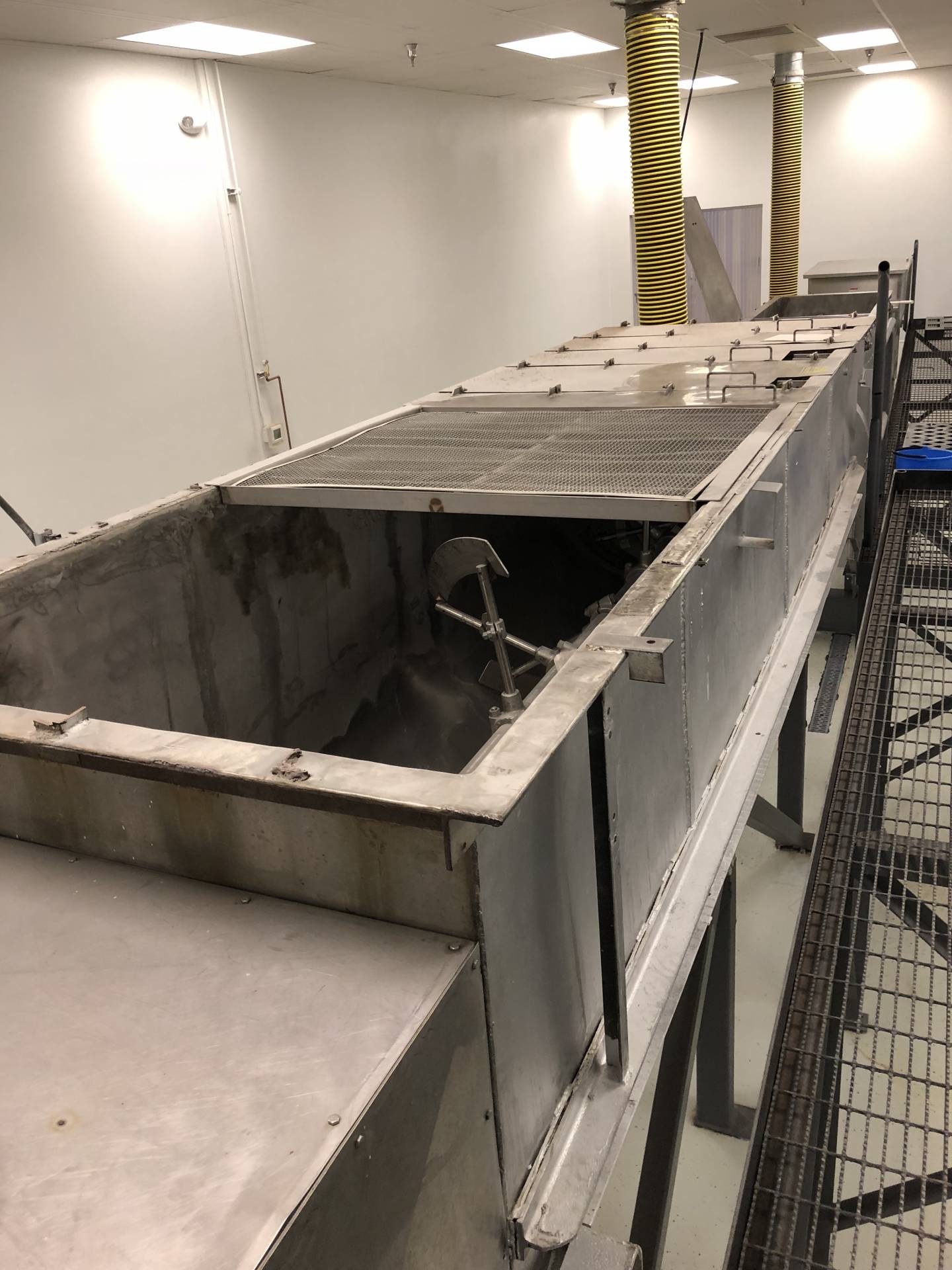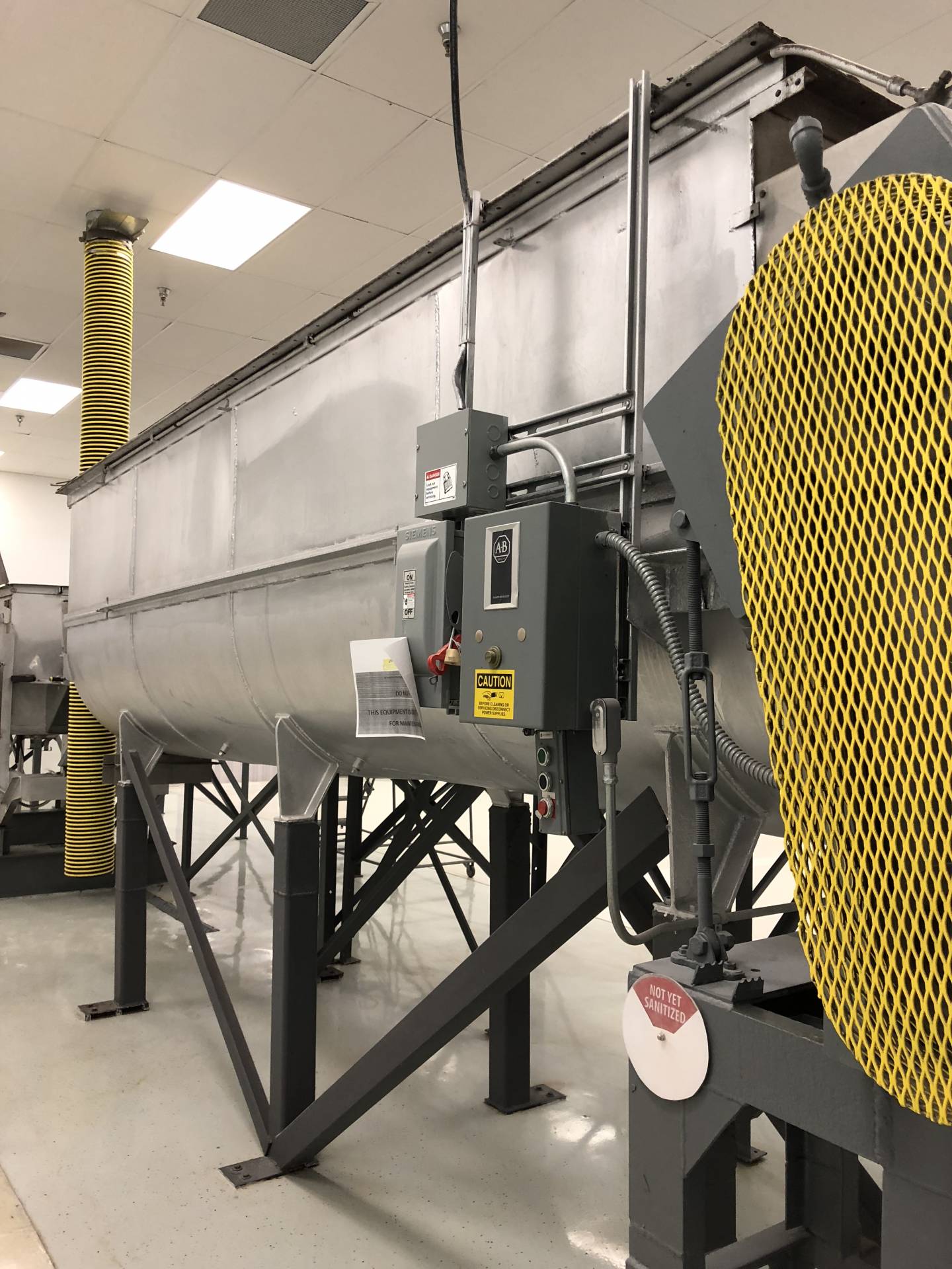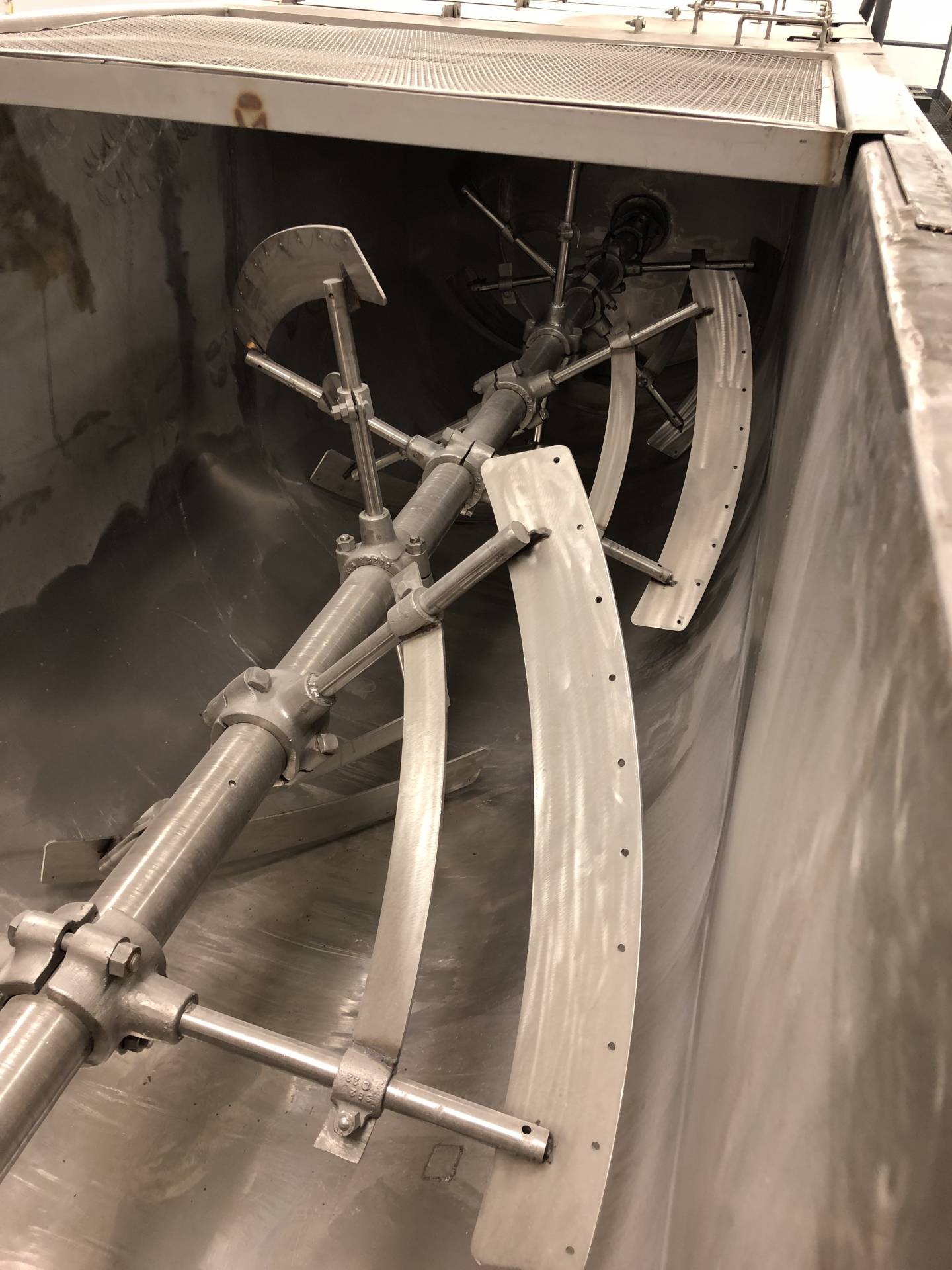 1-Used Robinson Approx. 225 Cu. Ft. Stainless Steel Jacketed Ribbon Blender, Shop #1395.. Last used for mixing protein powder, mixer has “interrupted ribbon”, and has interior tank dimensions measuring approximately 54 inch wide by 16 foot long by 48 inch deep. On stand providing for drum discharge, mixer has 9 inch by 9 inch bottom discharge with slide gate valve. With stainless steel cover, mixer has electric motor (220/440 volt) and gear box. On stand, overall height is approx. 10 Ft. (Stock #8398)