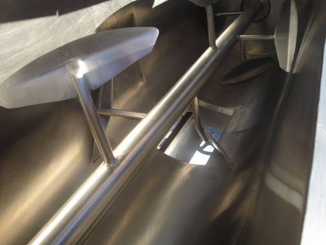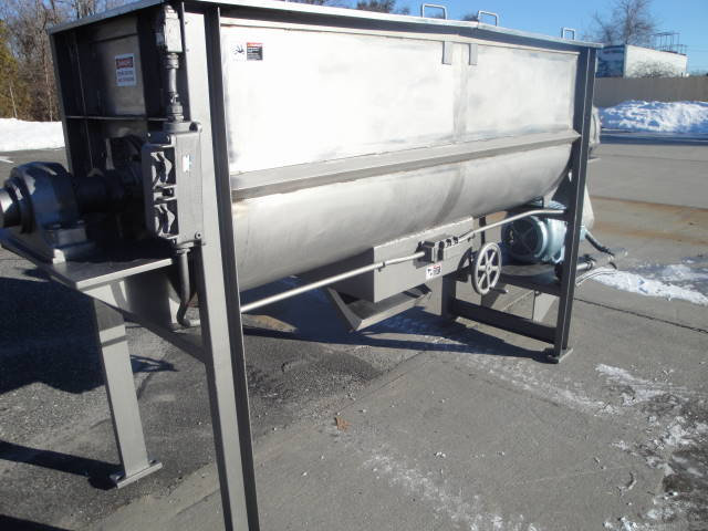 1-Used ross approximately 40 cu. Ft. Stainless steel paddle blender. Tank dimensions 30″ wide by 88″ long by 34″ deep. Driven by 20 hp 3/60/230 460 volt motor and dodge torque arm speed reducer. With stainless steel sectional hinged lids, blender has center bottom discharge outlet with valve. On legs providing for approximately 33″ under clearance, blender has forward and reverse controls. (stock #7449)