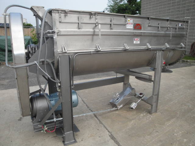 1-Used day 75 cu.ft. Stainless steel double ribbon blender, s/n 82139. Dimensions approx. 37 inches wide x 107 inches long x 40 inches deep. Driven by 20 hp gear motor, blender has stainless steel sectional hinged lid and slide paddle discharge valve with magnet. On legs, blender currently has approx. 31 inch underclearance. (stock # 7495a)