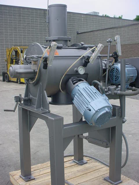 1-Used littleford model fm-130 stainless steel jacketed plow mixer, s/n 9964. Unit is jackted for 75psi at 320 degrees f, code stamped. Unit has capacity of 130 liter (4.6 cu. Ft.) and is on legs approximately 36″ high. With bottom discharge of approximately 4.5″ x 6″, mixer has discharge valve and was last used in a food facility. Equipped with high speed chopper blade driven by 10hp explosion proof motor, main drive is driven by 5hp explosion proof motor.