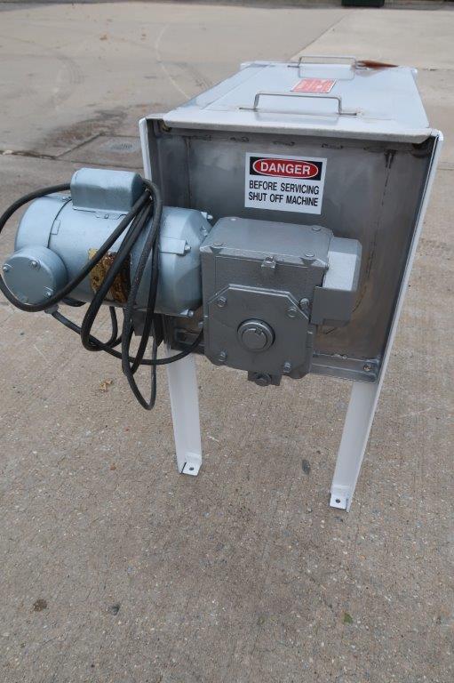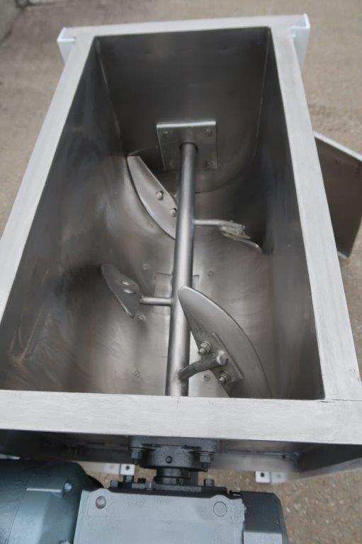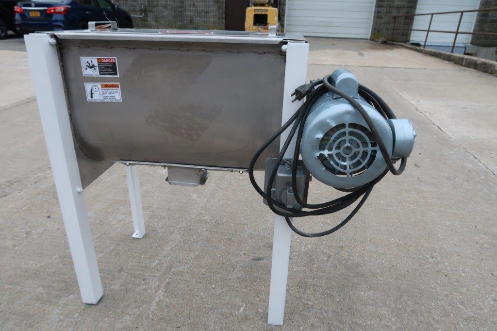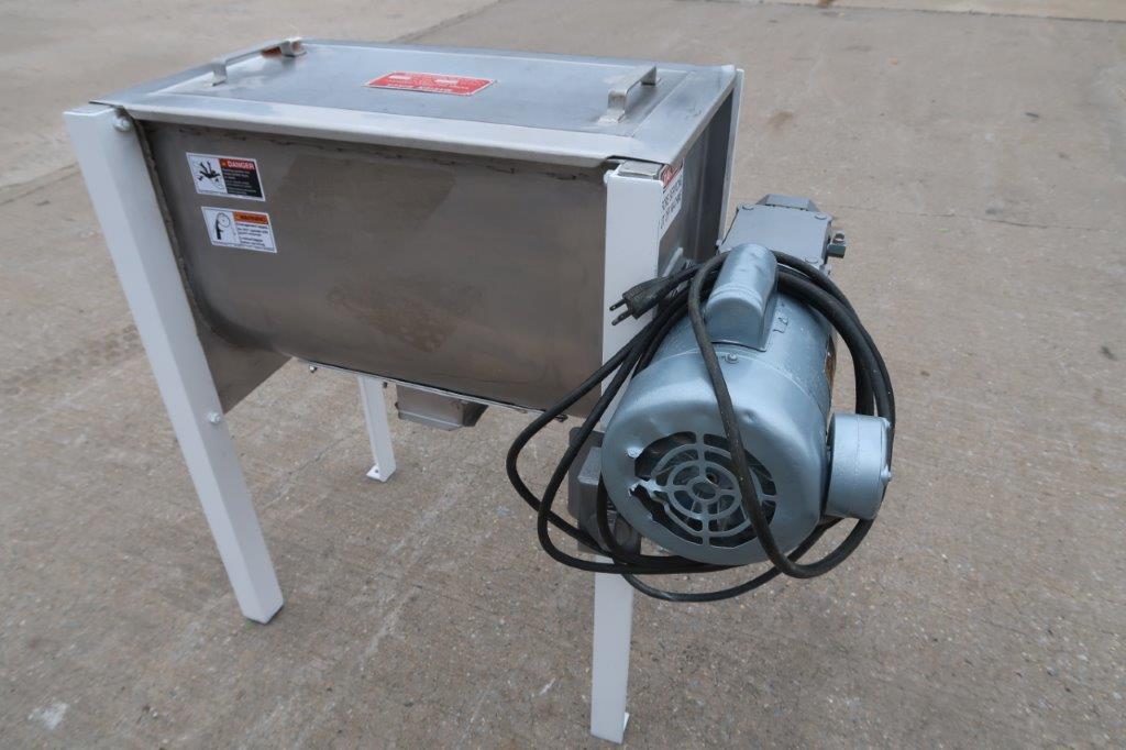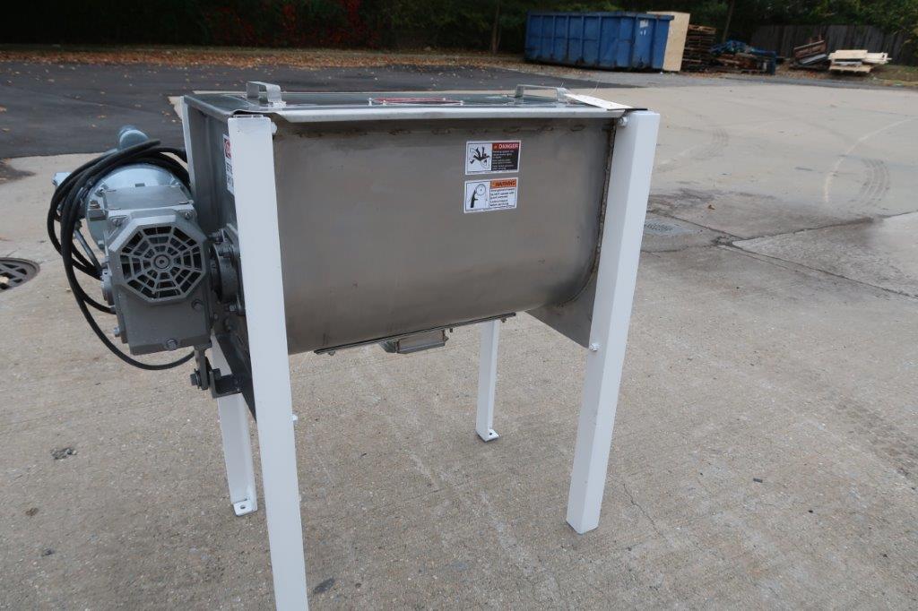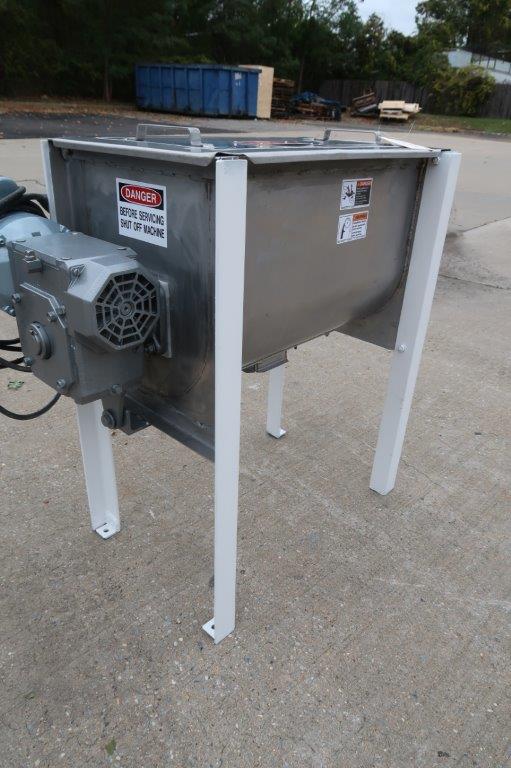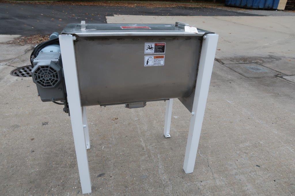 1-Used Marion Approximately 2 Cu. Ft. Working Capacity Stainless Steel Plow/Paddle Mixer, Model 1001, Serial Number 73078. Interior tank dimensions 12 In. Wide X 24 In. Long X 16 In. Deep. On stand, mixer is driven by 3/4 HP, single phase, 60 cycle, 230 Volt motor and is equipped with stainless steel cover. With 4 inch by 4 inch bottom discharge with slide valve. (Stock #8570C)