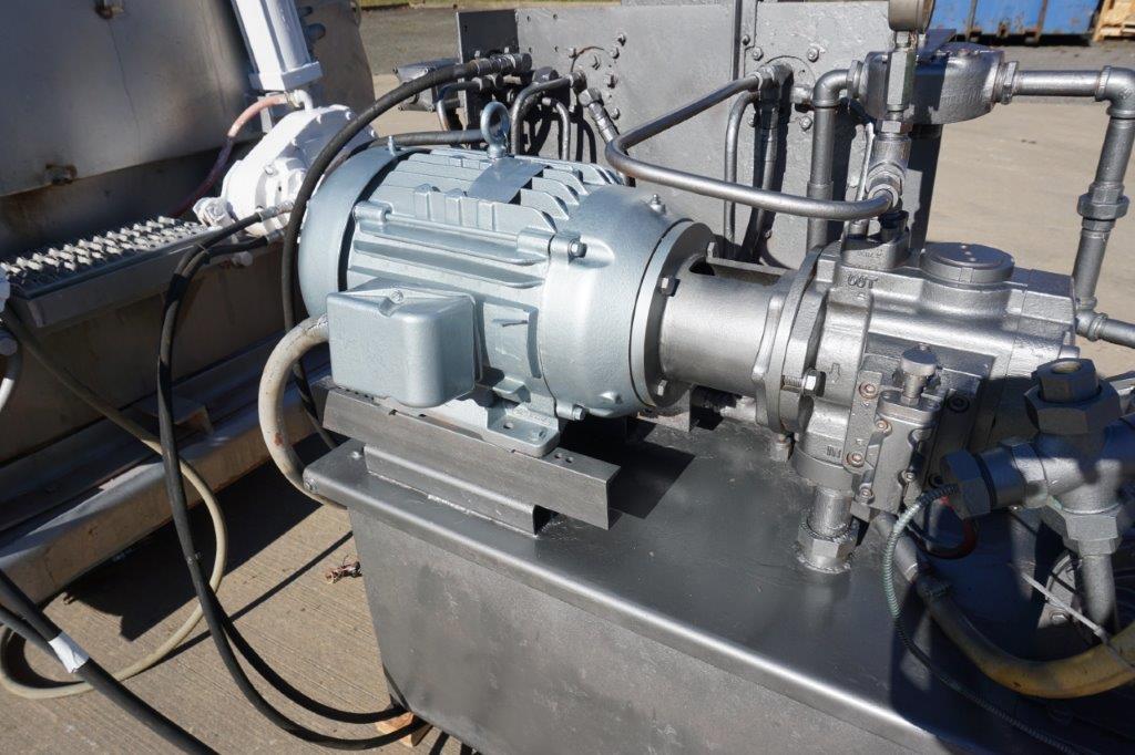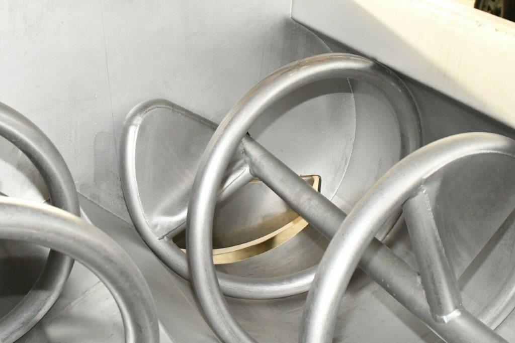 1-Used Amfec 3,000 Lb. Capacity Stainless Steel Twin Shaft Vacuum Ribbon Blender. Dimensions approx. 78 In. Wide X 116 In. Long X 66 In. High (without legs). Equipped with two high torque motors for driving ribbon assemblies, mixer has pneumatically operated lid. Equipped with end discharge. (Stock #8450)