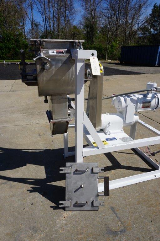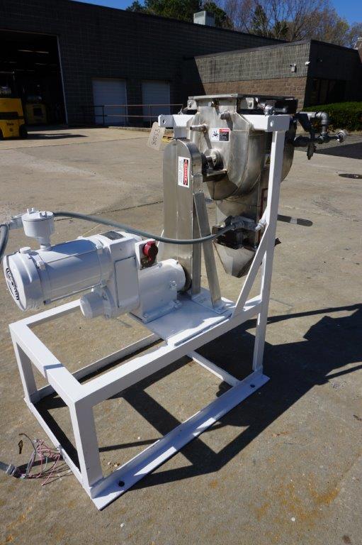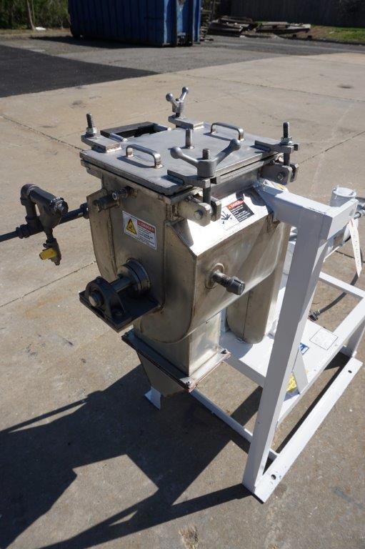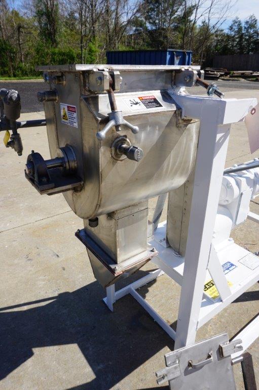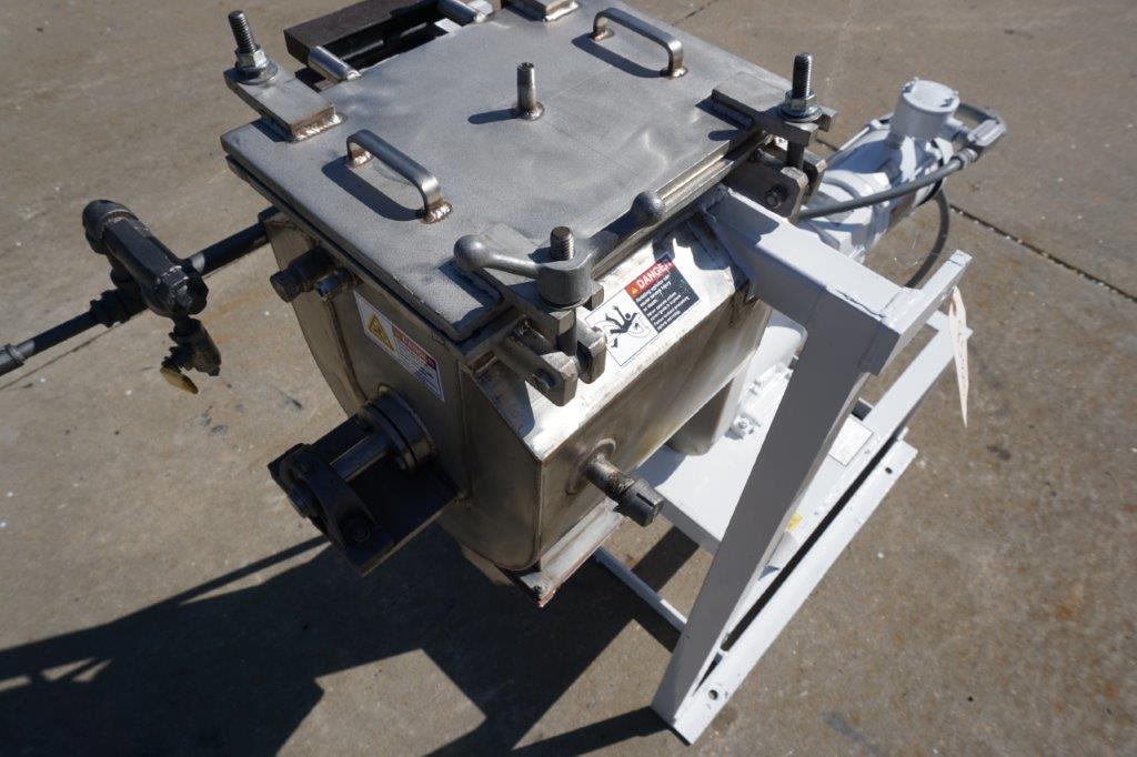 1-Used Paul O. Abbe Laboratory Stainless Steel Jacketed Double Ribbon Mixer, Serial Number A44491. Tank dimensions approximately 8 In. Wide X 12 In. Long X 13 In. Deep, machine is rated 14.7 PSI@450 Degrees F. in the jacket and 14.7 PSI @450 Degrees F. internally as well. On legs, blender has approximately 1-1/2 In. diameter center bottom outlet with hand operated valve. Driven by 3/4 HP 3/60/230-460 Volt Explosion Proof motor, Mixer has top stainless steel heavy-duty lid. (Stock #8502B)