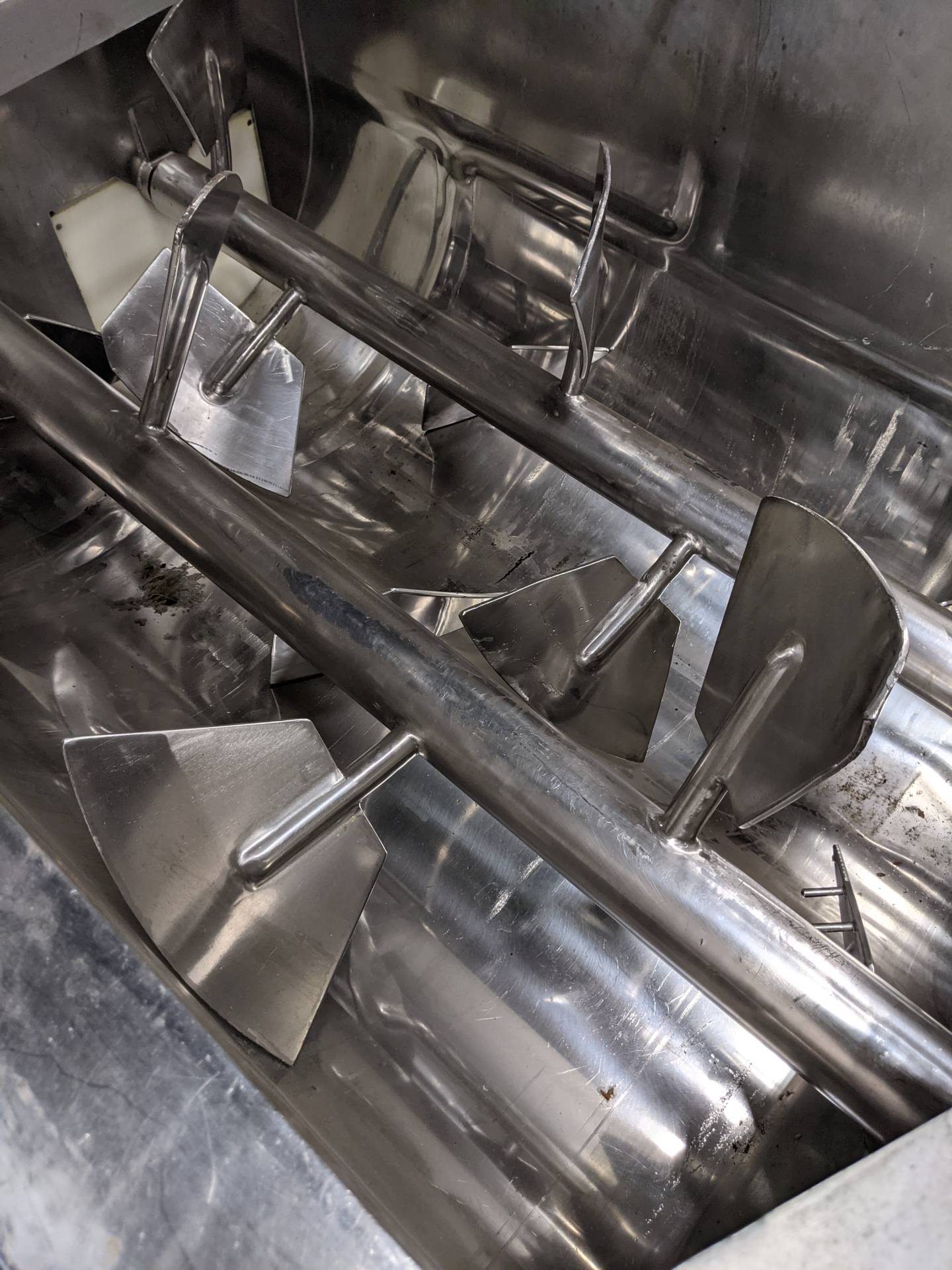 1-Used Risco Model RS2200 Stainless Steel Horizontal Paddle Blender, S/N 149001. Interior dimensions approximately 49 In. Wide X 71 In. Long X 36 In. Deep. This twin shaft paddle blender is driven by 30HP, 3/60/480 Volt motor with speed reducer. Equipped with air operated end discharge measuring 12 In. X 17 In. Last used in the meat industry. (Stock #8596)