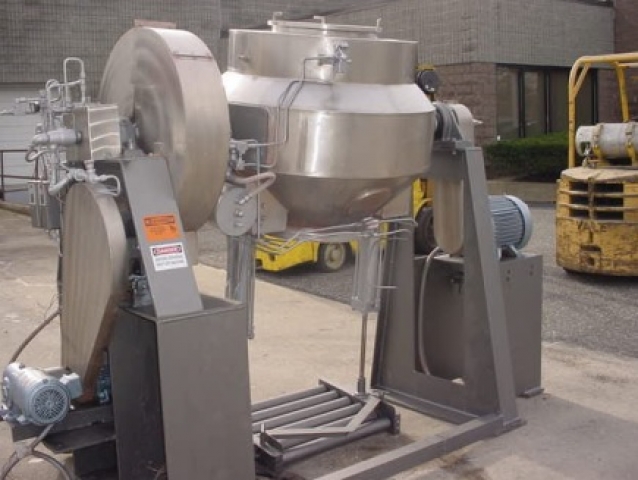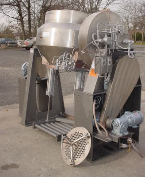 1-Used Gemco Approx. 10 Cu. Ft. Stainless Steel Double Cone Tumbling Blender. Equipped with “Gemcomatic” drum unloading/loading device. With liquid additive intensifier bar driven by 10 HP/5 HP 3/60/220 Volt 2-speed motor. Also equipped with 10 HP 3/60/230/460 Volt main drive motor for tumbling tank. With control panel. (STOCK #7976)