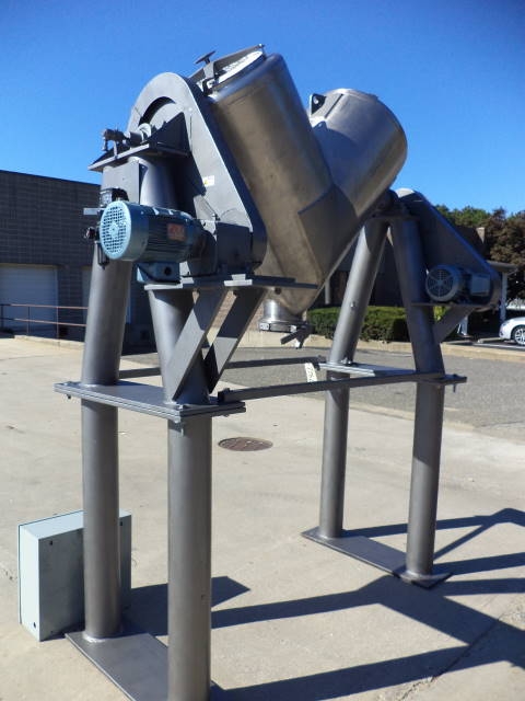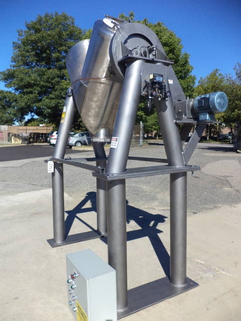 1-Used Patterson Kelley 10 Cu. Ft. Stainless Steel Twin Shell “Liquid-Solids” “V” Blender, S/N 270690. Blender equipped with “Liquid-Solids” Intensifier Bar and is equipped with 5 HP 3/60/230-460 volt and 1.5 HP 3/60/230-460 volt motor for “Liquid-Solids” bar and Blender Tank respectively. With top covers, Blender has approx. 8 in. diameter butterfly style discharge valve. Rated at 70 lbs. per cubic foot maximum density. Blender is on stand with leg extensions and has control panel. (Stock #7921)