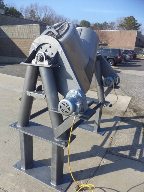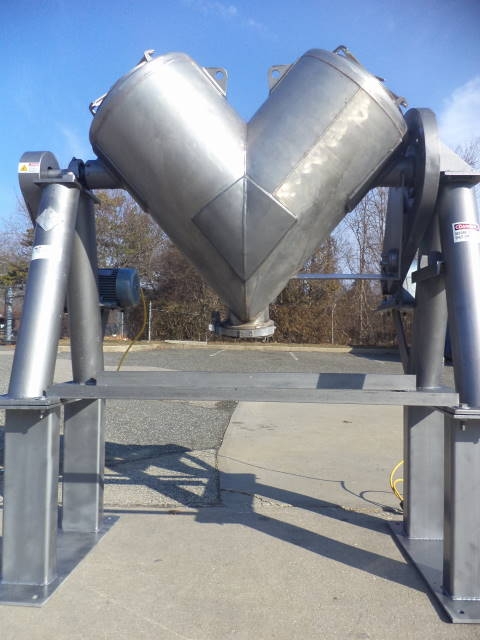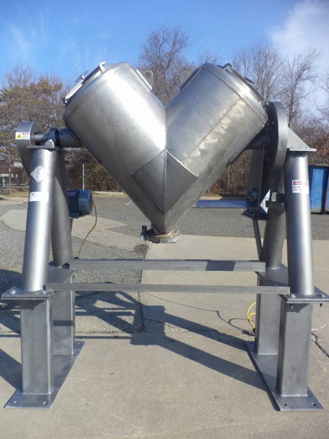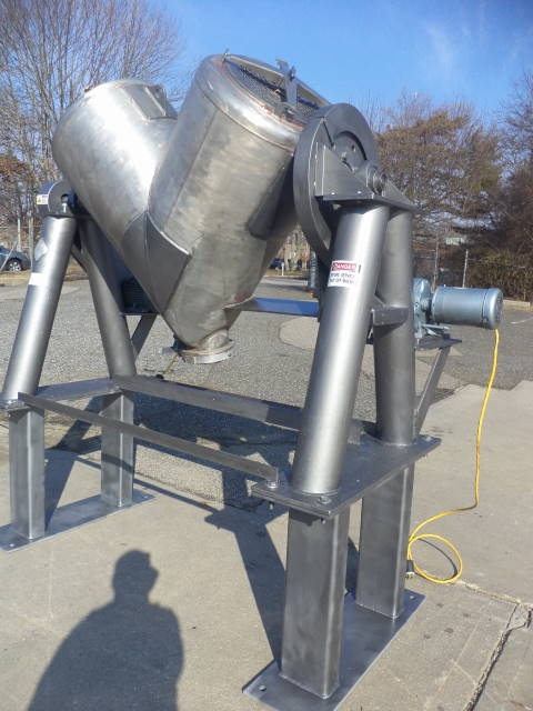 1-Used Patterson Kelley 10 cu.ft. Stainless Steel Twin Shell “V” Blender, S/N 249032. Rated 70 lbs. per cubic foot maximum density, Blender on stand and has approx. 30 in. leg extensions for drum height clearance. Equipped with Intensifier Bar, driven by 5 HP 3/60/230-460 volt motor. Main drive motor for Tank is 1.5 HP 3/60/208-230-460 volt. Equipped with approx. 8 in. diameter butterfly discharge and valve. (Stock #7973B)