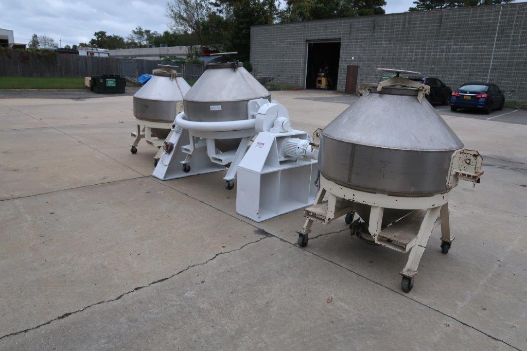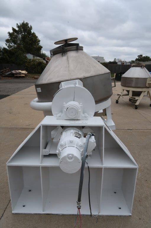 1-Used Komline Sanderson Approximately 20 Cubic Foot Stainless Steel Double Cone Blender, Serial Number B-58. Equipped with Five (5) stainless interchangeable tanks, blender is driven by 2HP, 3/60/208-220/440 Volt motor with Stearns electric brake. Each tank has hand operated butterfly valve and measures approximately 49 In. inside diameter. Last used in flavoring industry. (Stock #8570G)