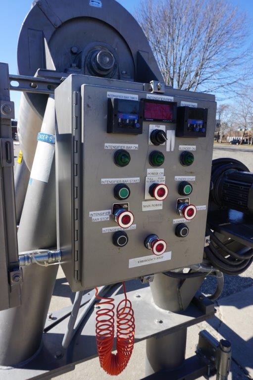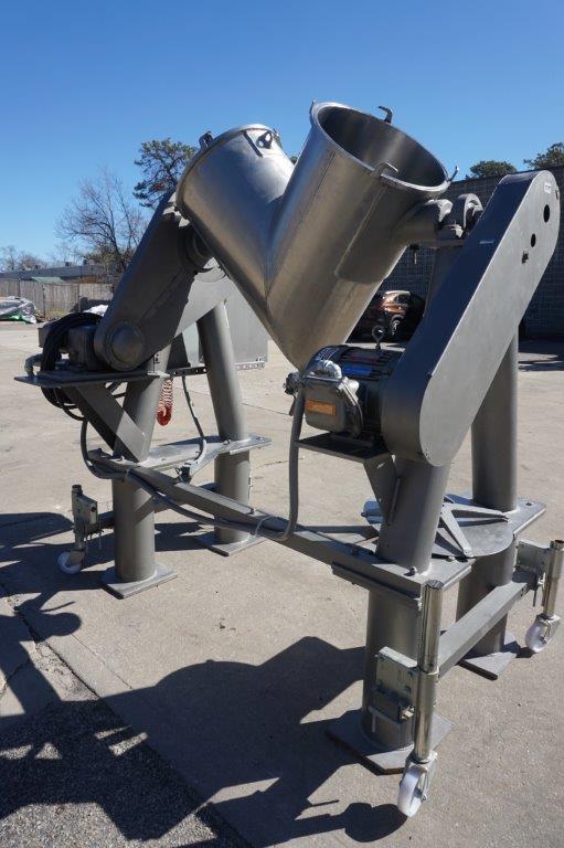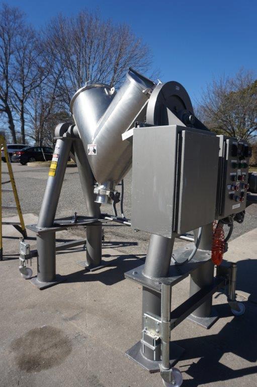 1-Used Patterson Kelley 5 Cubic Foot Stainless Steel Twin Shell V Blender, Serial number 273570. Rated up to 240 lbs./cf maximum density. Equipped with pin type intensifier bar, blender has 3HP 3/60/230-460 volt explosion proof motor, as well as 1.5 HP 3/60/230-460 volt motor. Blender is on stand with leg extensions, providing for approximately 38 inch under-clearance and has 6 inch diameter butterfly discharge valve. Equipped with control panel with variable speed control, and timers. On casters for portability, machine last used in the pharmaceutical industry. (Stock #8475B)
