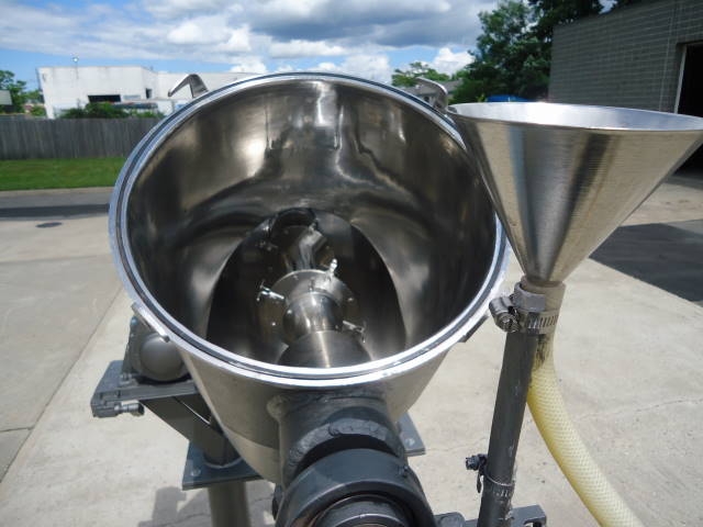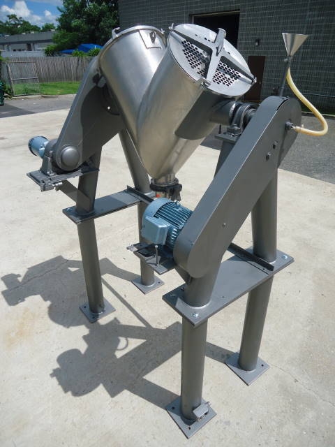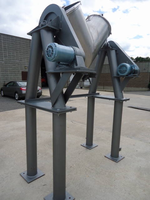 1-Used patterson kelley 5 cu.ft. Stainless steel twin shell “liquid-solids” “v” blender, s/n 244071. Blender equipped with “liquid-solids” intensifier bar and is equipped with 5 hp 3/60/230-460 volt and 3/4 hp 3/60/230-460 volt motor for “liquid-solids” bar and blender tank respectively. With top covers, blender has approx. 6 in. Diameter butterfly style discharge valve. Rated at 70 lbs. Per cubic foot maximum density. Blender is on stand with leg extensions. (stock # 7596a)
