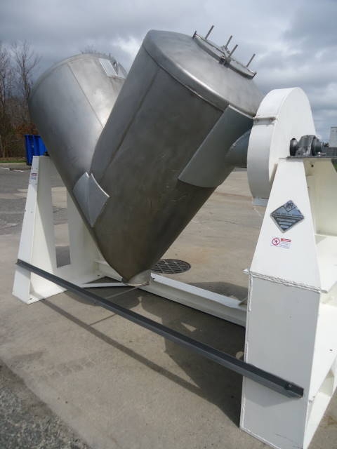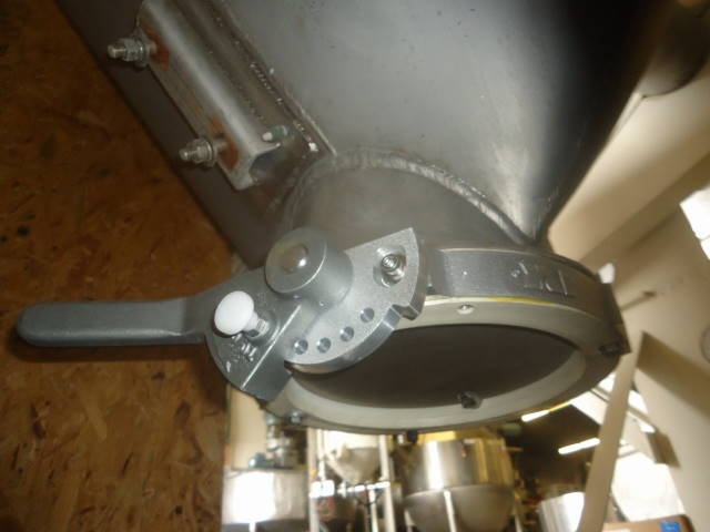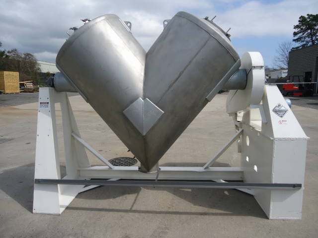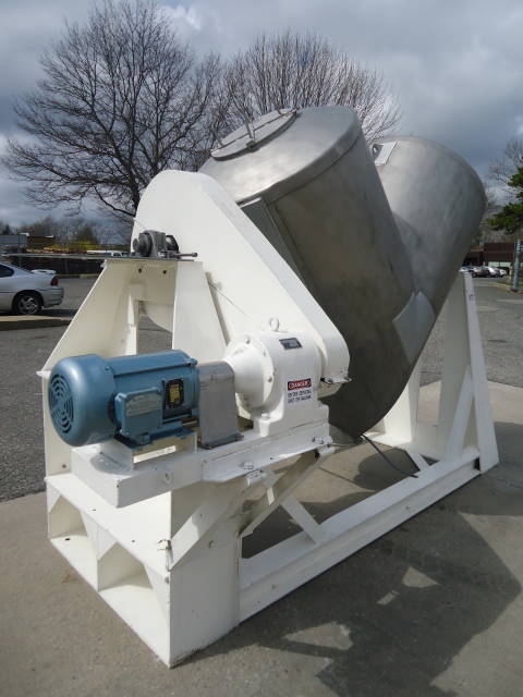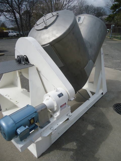 1-Used patterson kelley 50 cu.ft. Stainless steel twin shell “v” tumbling blender, s/n 117051. Rated 54 lbs. Per cubic foot maximum density. On stand, blender driven by 5 hp explosion proof motor and reducer. With approx. 10 in. Diameter discharge with approx. 10 in. Diameter unused patterson kelley butterfly valve. (stock # 7565b)