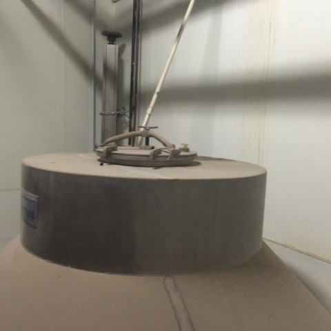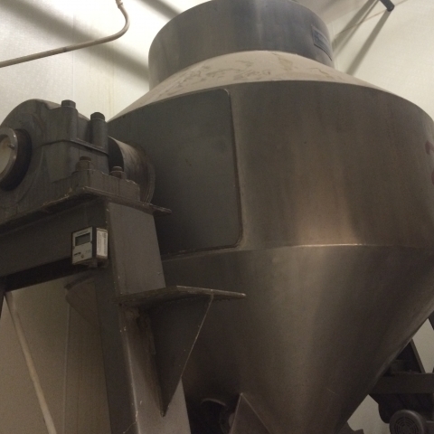 1-Used Gemco 100 cubic foot double cone stainless steel tumbling blender. Mounted on stand. Blender was last used at a nutraceuticals facility. Blender rated 50 LBS/CF maximum density. (L1209)