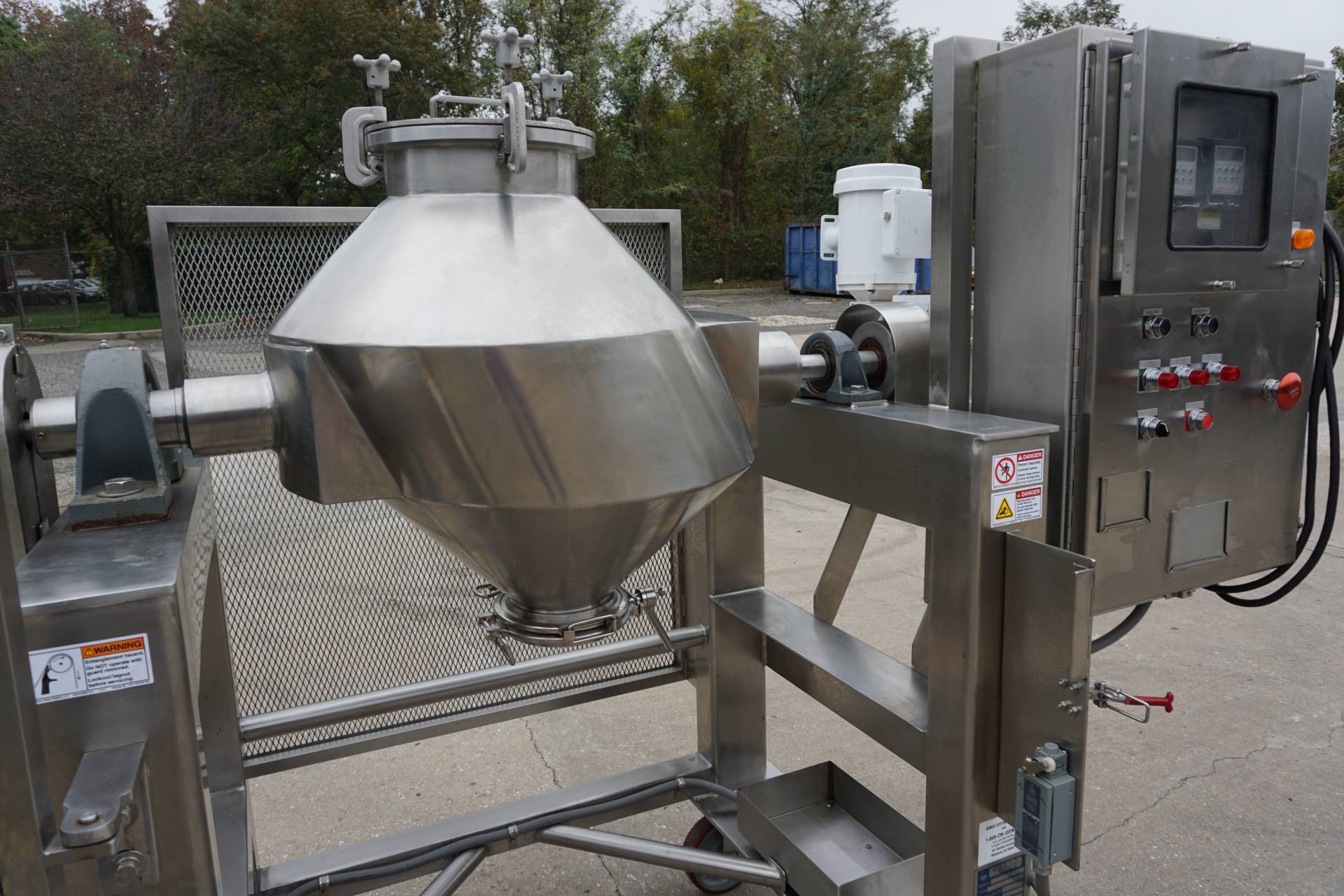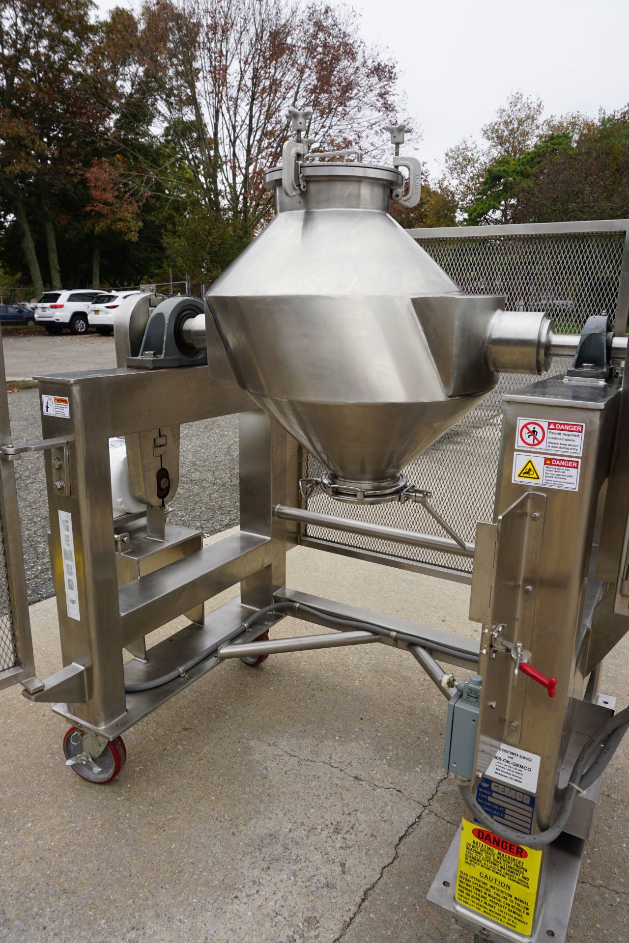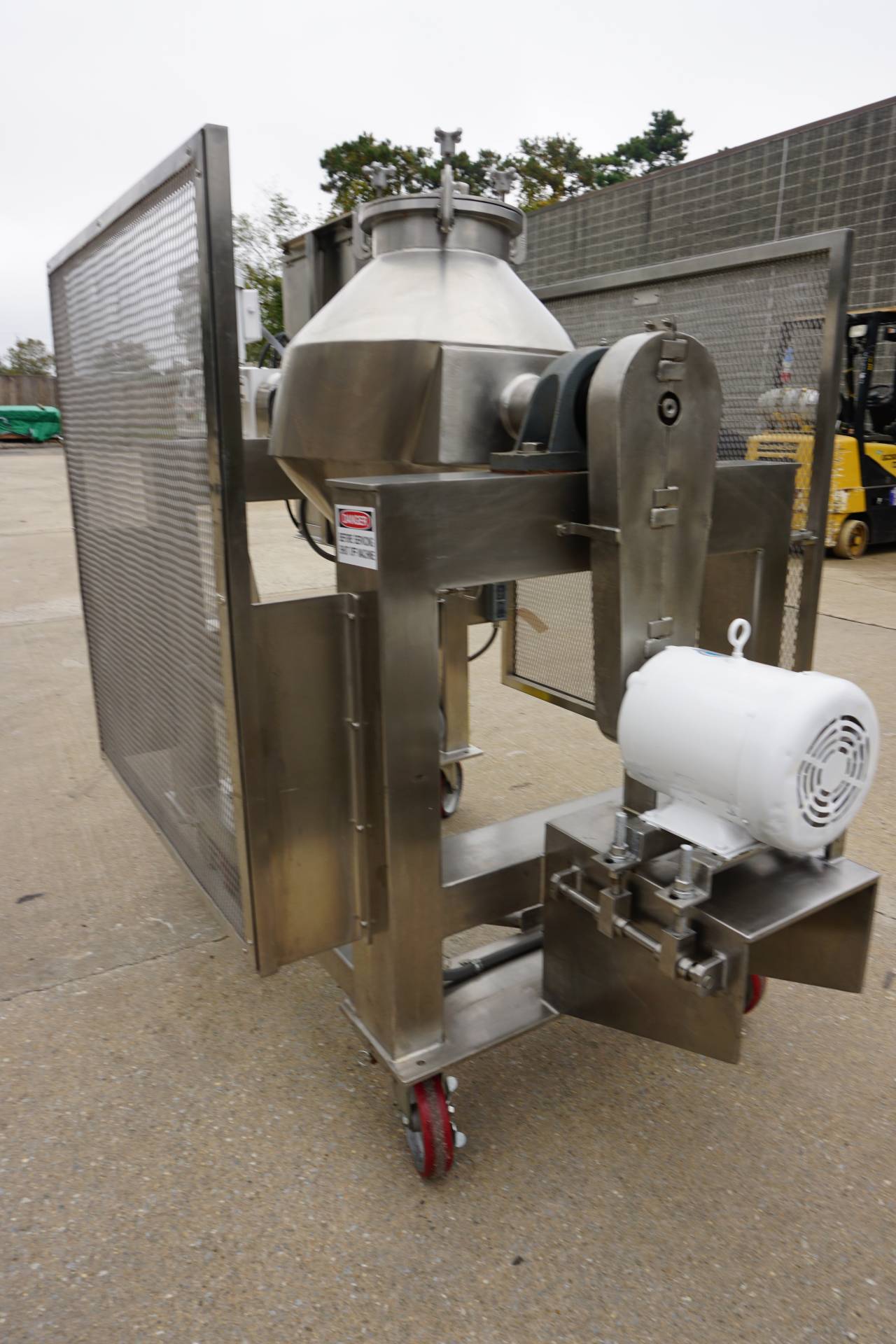 1-Used Gemco 3 Cu. Ft. Type 316 Stainless Steel Portable Slant Cone Blender, S/N B-91458. Mounted on portable structure with casters, this pharmaceutical grade Tumbling Blender has intensifier bar driven by 3HP/1.5 HP 3/60/480 Volt motor, as well as main drive motor of 1HP, 3/60/208-230/460 volt. With side mounted dedicated control panel with digital controls, Blender also has stainless steel starter box and safety cage. Unit rated 90 lb./cf. maximum density. (Stock# 8432A)
