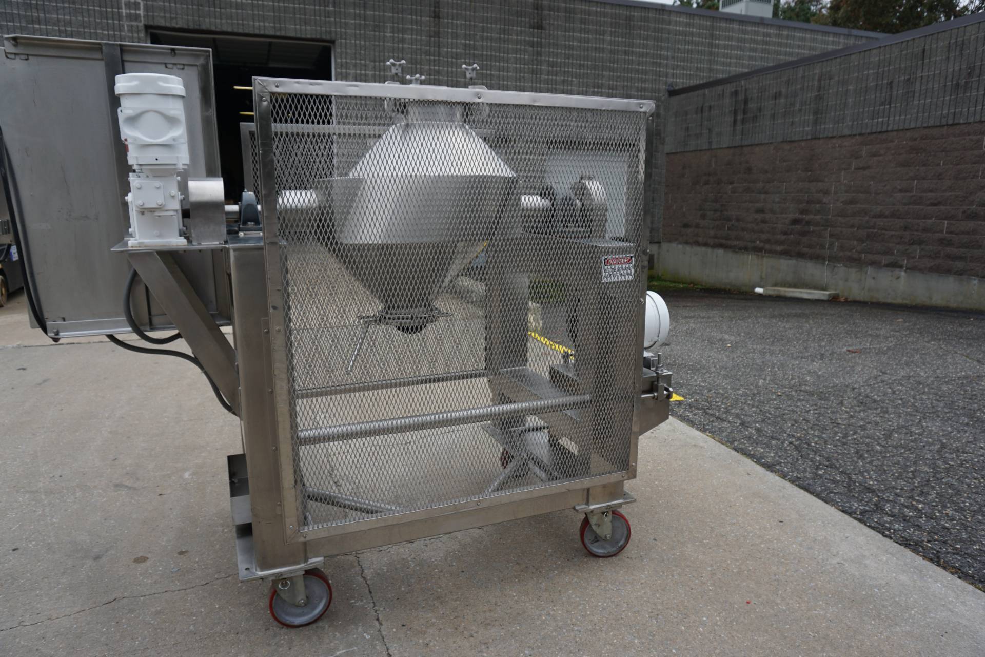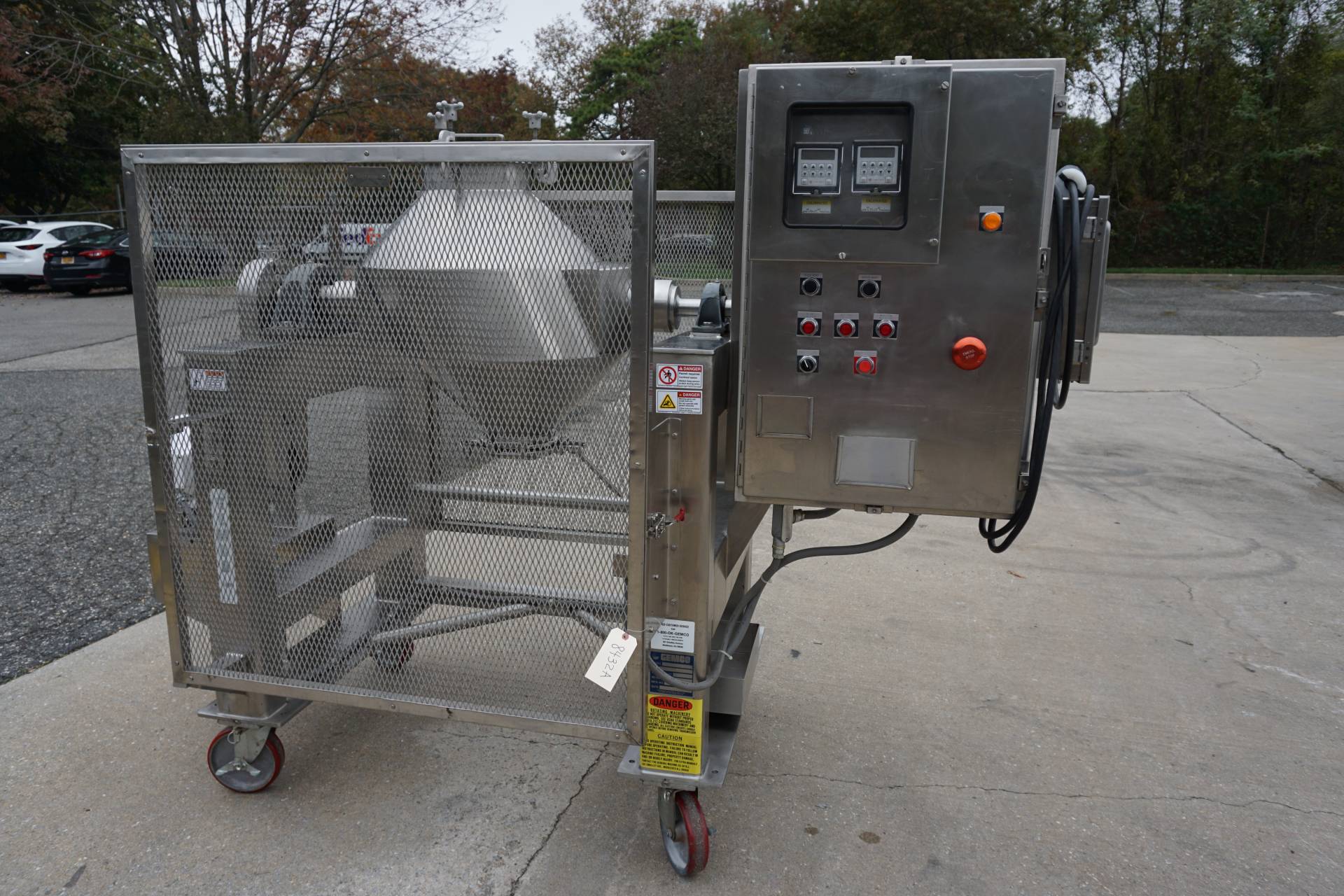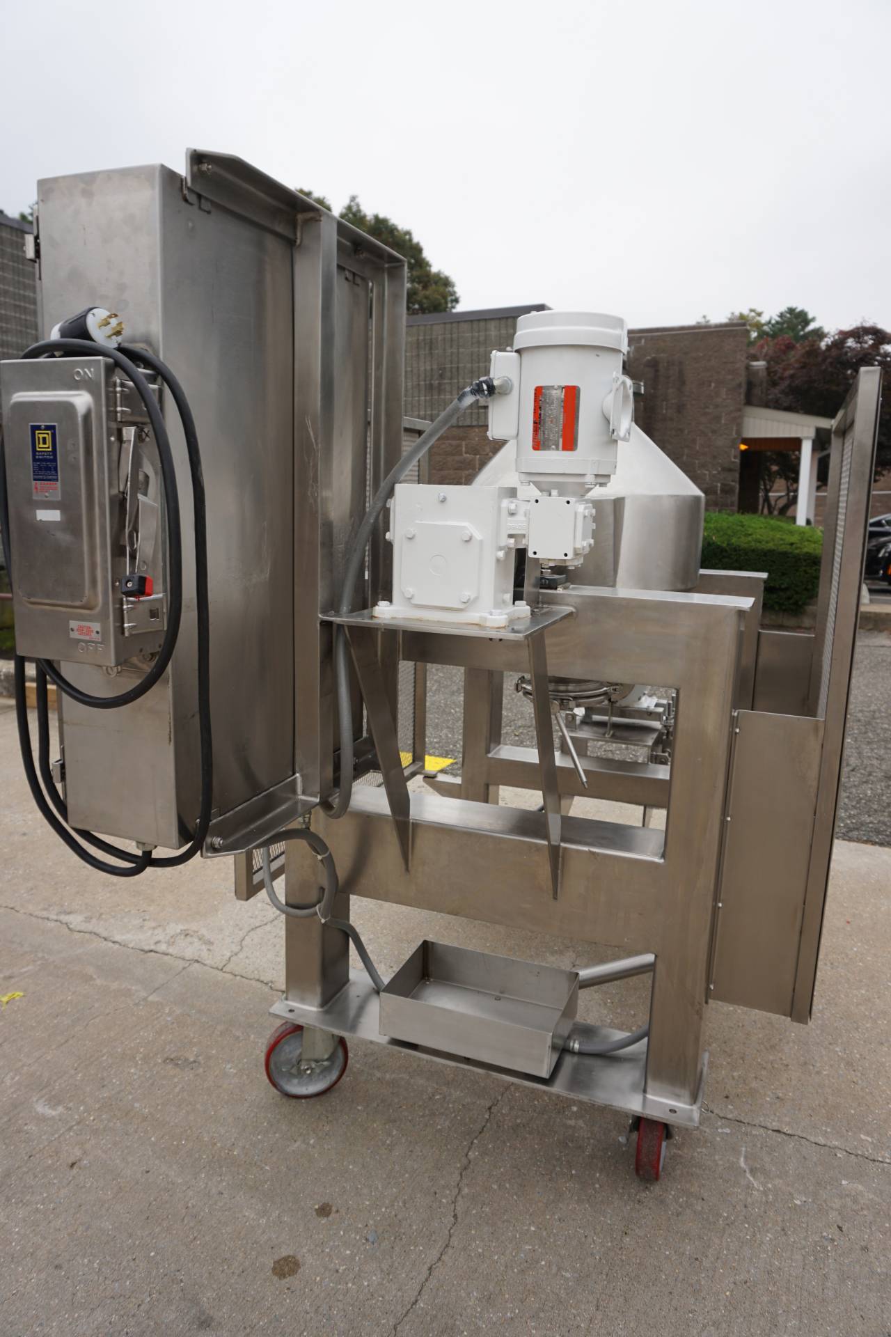 1-Used Gemco 3 Cu. Ft. Type 316 Stainless Steel Portable Slant Cone Blender, S/N B-91458. Mounted on portable structure with casters, this pharmaceutical grade Tumbling Blender has intensifier bar driven by 3HP/1.5 HP 3/60/480 Volt motor, as well as main drive motor of 1HP, 3/60/208-230/460 volt. With side mounted dedicated control panel with digital controls, Blender also has stainless steel starter box and safety cage. Unit rated 90 lb./cf. maximum density. (Stock# 8432A)