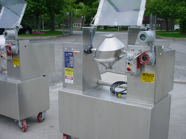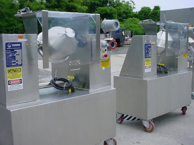 1-USED GEMCO 8 QT. STAINLESS STEEL SLANT CONE PORTABLE TUMBLING BLENDER, S/N G-LB.97121. RATED 60 LBS. PER CUBIC FOOT MAXIMUM DENSITY, BLENDER MOUNTED ON PORTABLE STAINLESS STEEL CABINETRY WITH CASTERS. WITH PLEXIGLASS ENCLOSURES. ELECTRIC SPECIFICATIONS: SINGLE PHASE, 60 CYCLE, 120 VOLT. BLENDER CURRENTLY SET FOR 23.2 RPM. WITH DIGITAL TIMERS, BLENDER HAS EXPLOSION PROOF STARTER BOX. (STOCK #7321AB)