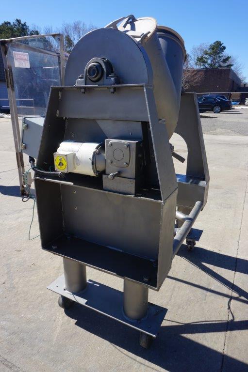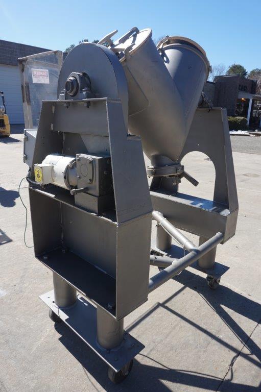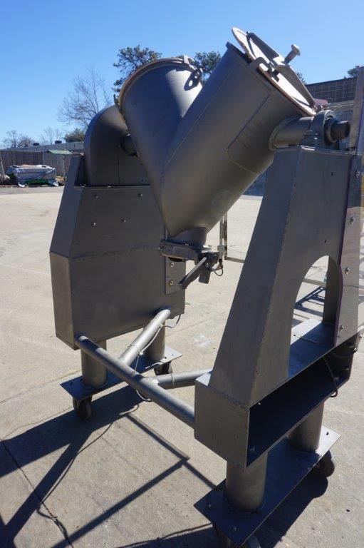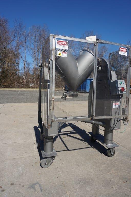 1-Used Patterson Kelley 2 Cu.Ft. Stainless Steel “V” Blender. On portable stand with casters, Blender driven by 3/4 HP 3/60/208-230-460 volt Leeson Washguard Motor. Equipped with plexiglass guarding , machine on short leg extensions and equipped with approx. 6 in. diameter butterfly discharge valve. Last used in pharmaceutical industry, machine has on/off starter box. (Stock # 8481)