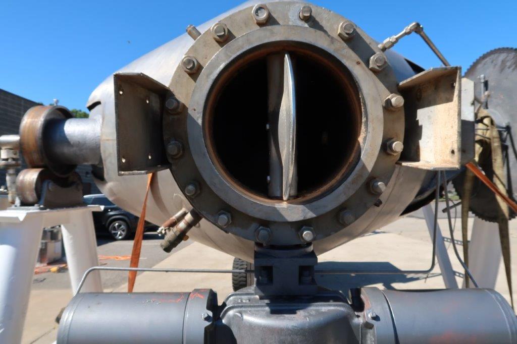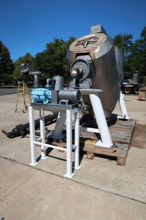 1-Used Patterson Kelley 60 Cubic Foot Twin Shell Jacketed Vacuum Formulator/Dryer/Blender System, Serial number 244207. Last used for Veterinary supplements, machine has stainless steel contact parts, and is jacketed for 15 PSI@ 200 Deg. F., Hydrostatic test pressure 90 psi, National Board number 39626, code stamped. On stand, system comes with Reimers HLR-45 Boiler for dryer jacket, Doyle & Roth Condenser, Stainless Steel recovery tank and Kinney 5 HP Liquid Ring Vacuum pump. With 16 In. diameter pneumatic discharge (Stock #8680B)