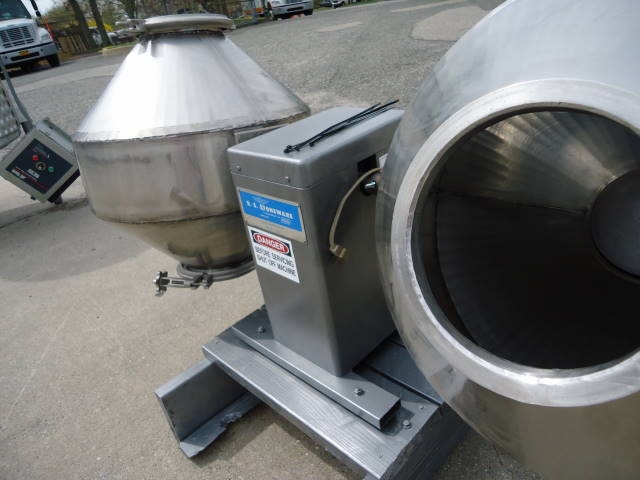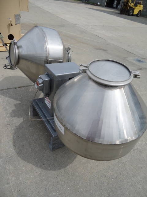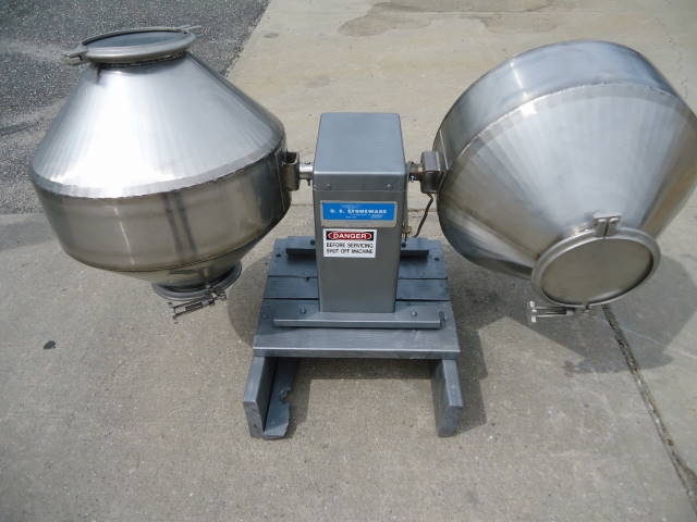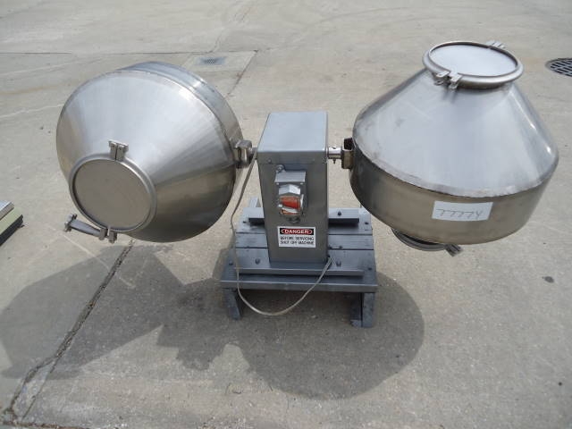 1-USED U.S. STONEWARE TABLETOP STAINLESS STEEL LABORATORY DOUBLE CONE BLENDING SYSTEM, S/N DA-69107. WITH TWIN 24 INCH WIDE CHAMBERS, EACH APPROXIMATELY 2 CU. FT. SIZE. DRIVEN BY SINGLE PHASE ELECTRIC MOTOR. (STOCK# 7777Y)