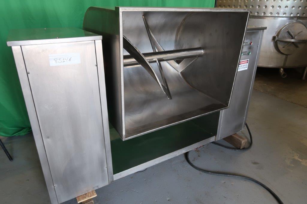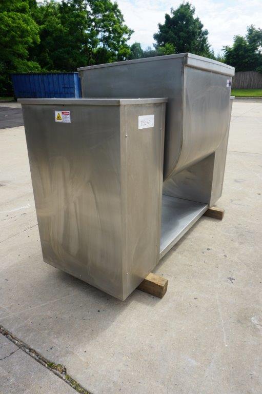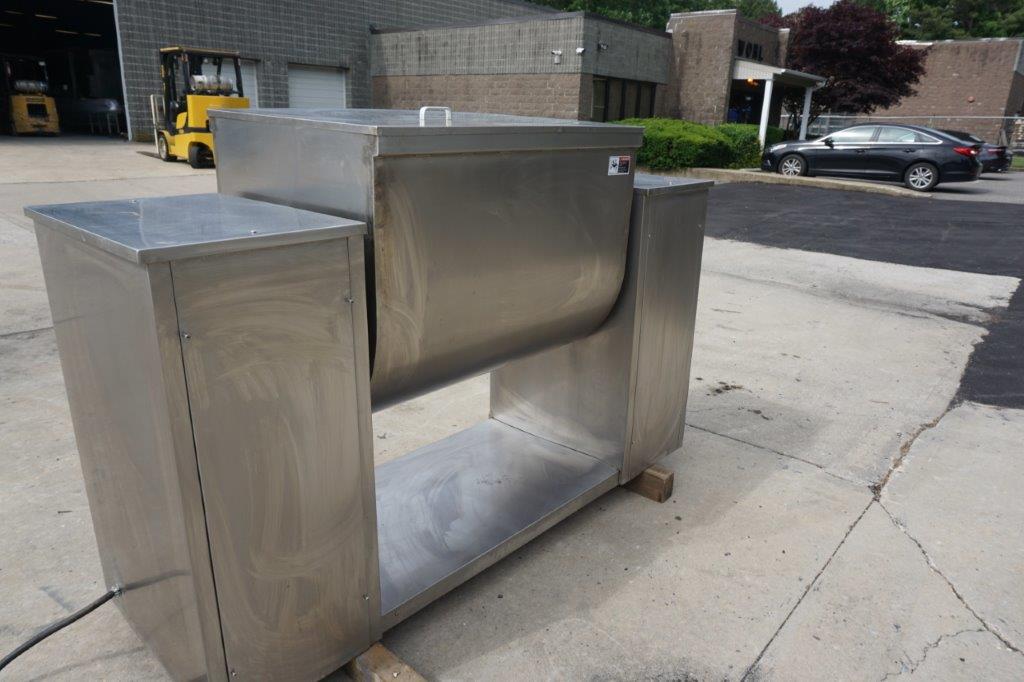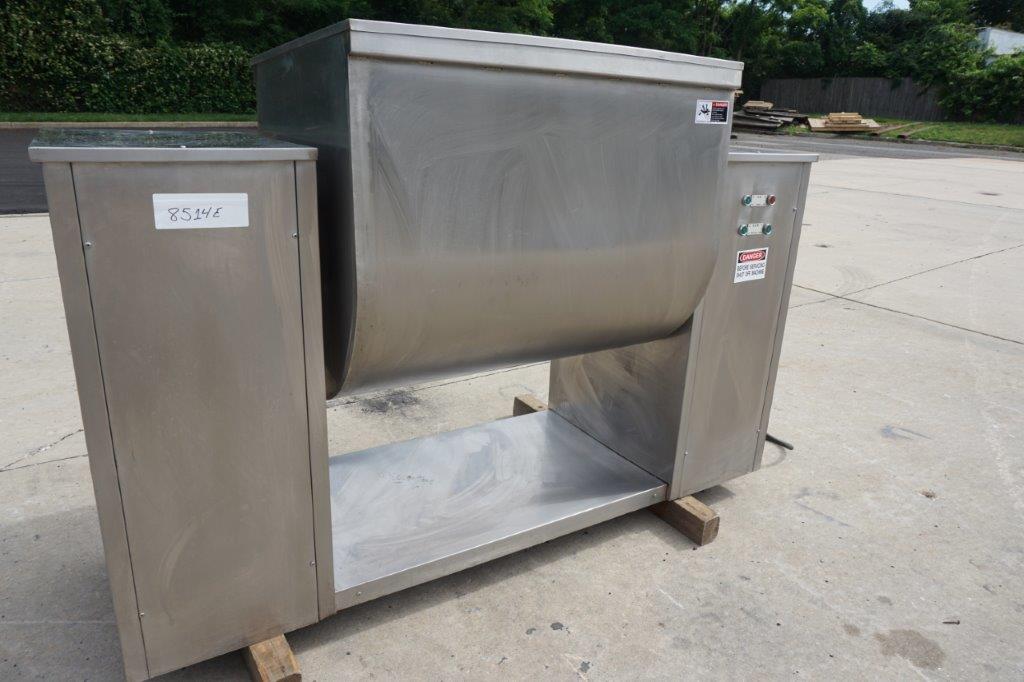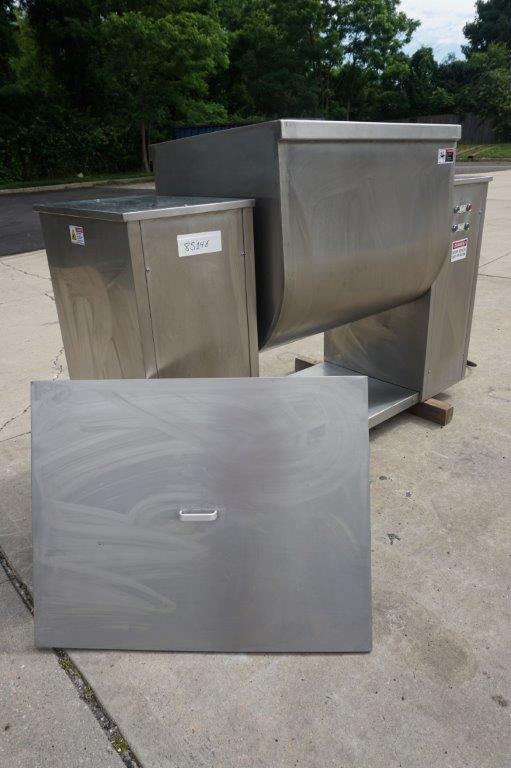 1-Used Approx. 15 Cu. Ft. Stainless Steel Granulating Mixer. Equipped with “Z” blades, trough dimensions measure approx. 28 In. Wide X 35 In. Long X 29 In. Deep. Equipped with stainless steel lid, mixer has tilt discharge and “push-button” starter. Mixing arms driven by 5.5HP motor and mixer tilt discharge motor is 2.2 HP. Last used in the vitamin industry for granulation mixing of powders. (Stock #8514E)
